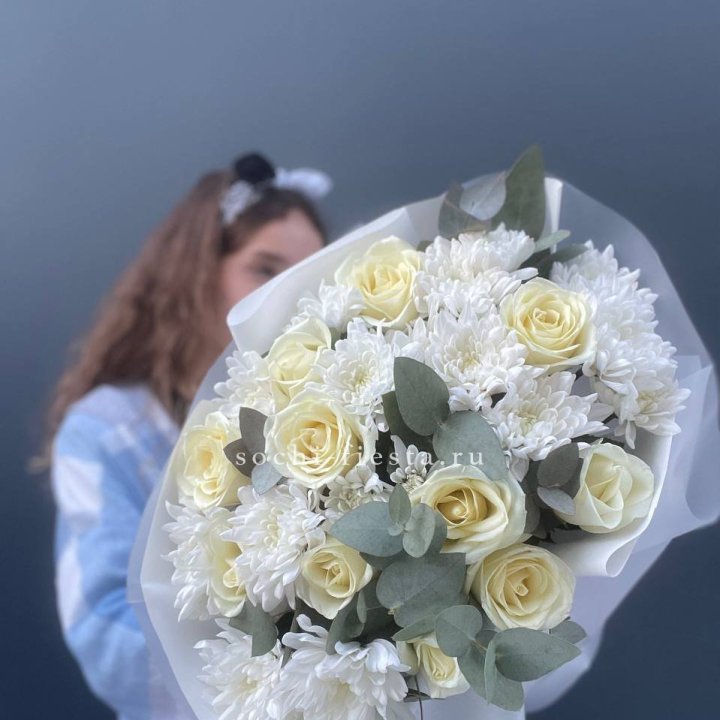 Букет белых роз с хризантемой