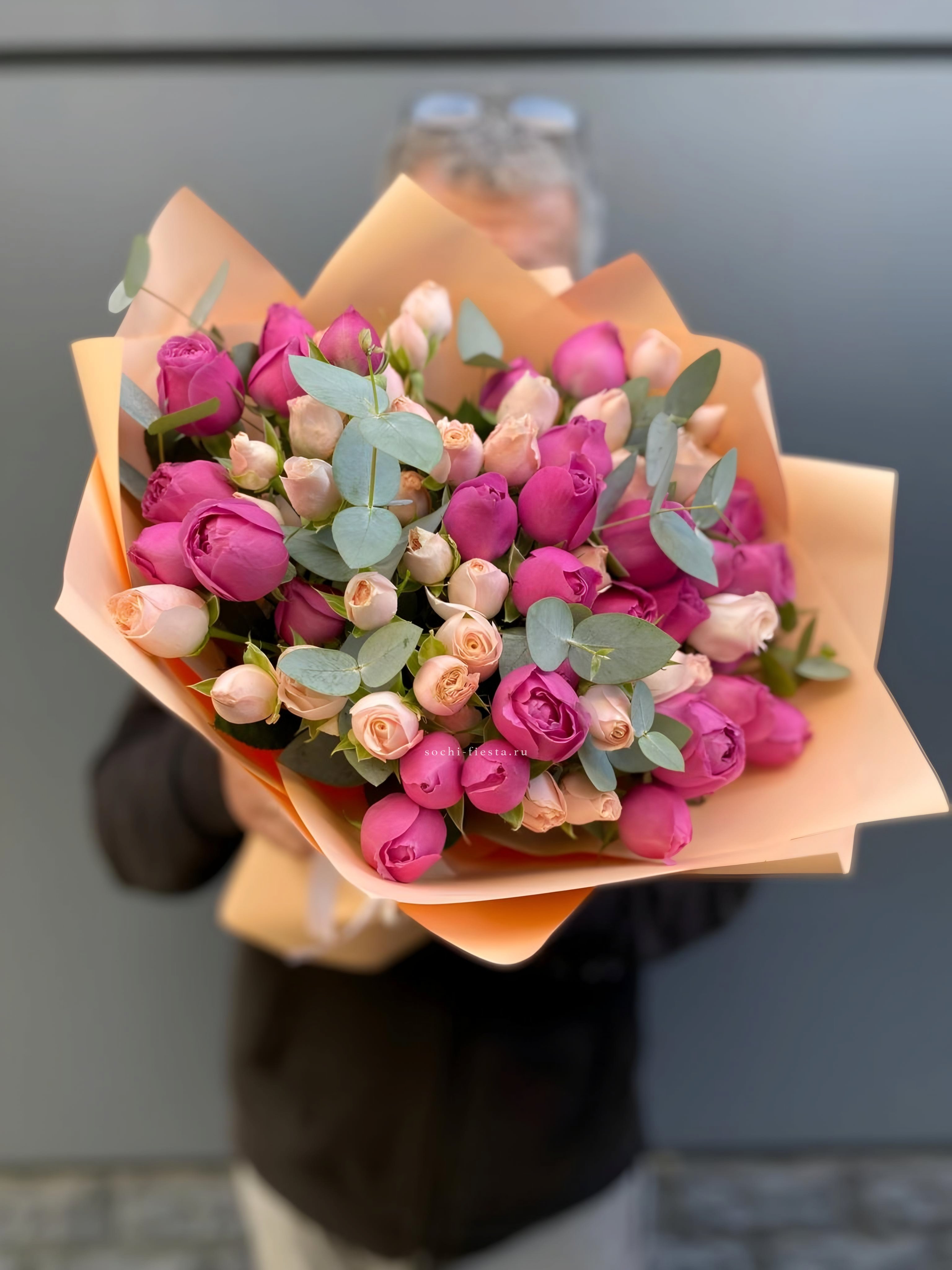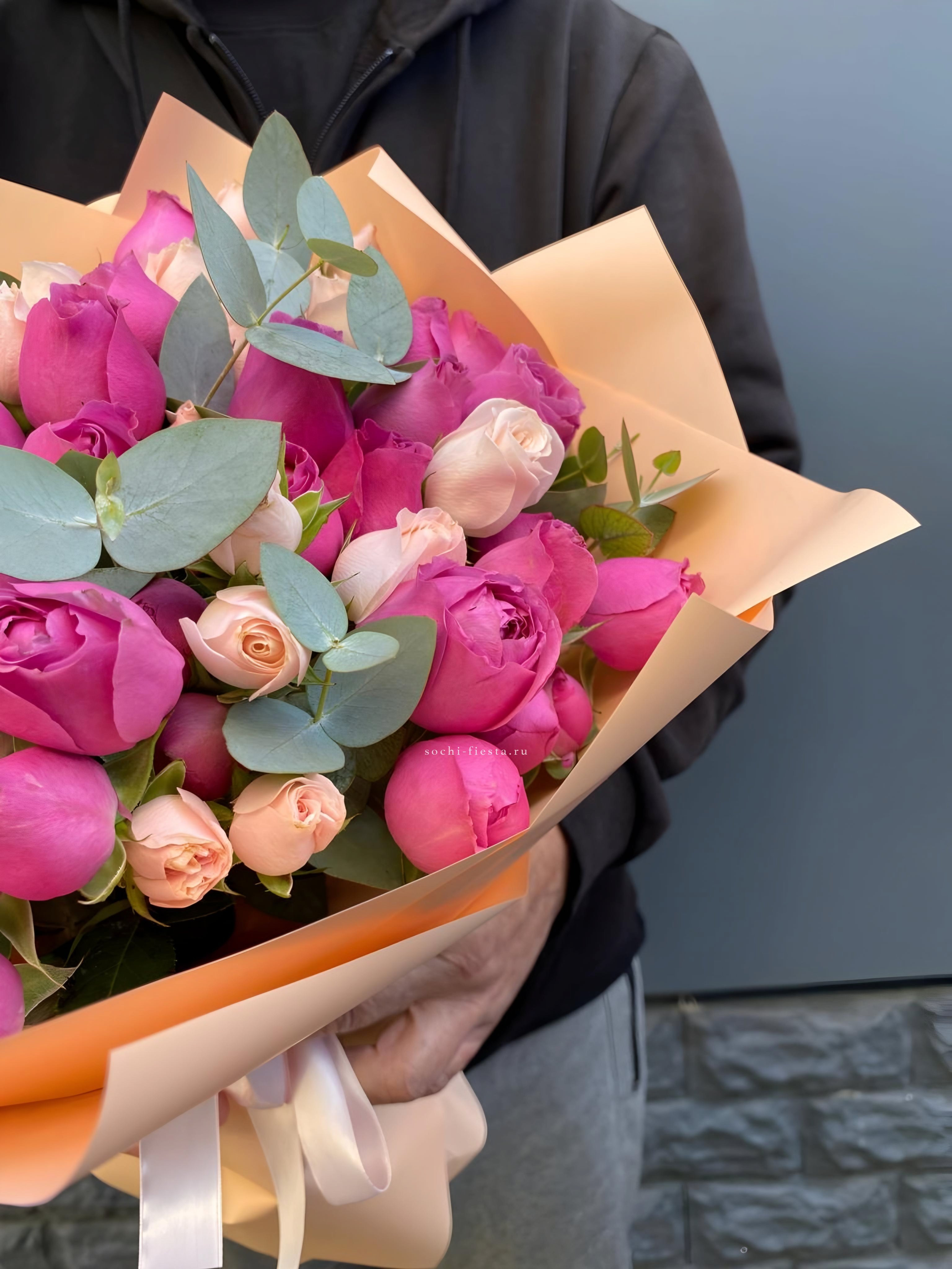 французские розовые розы в оформлении с эвкалиптом  На фото 11.