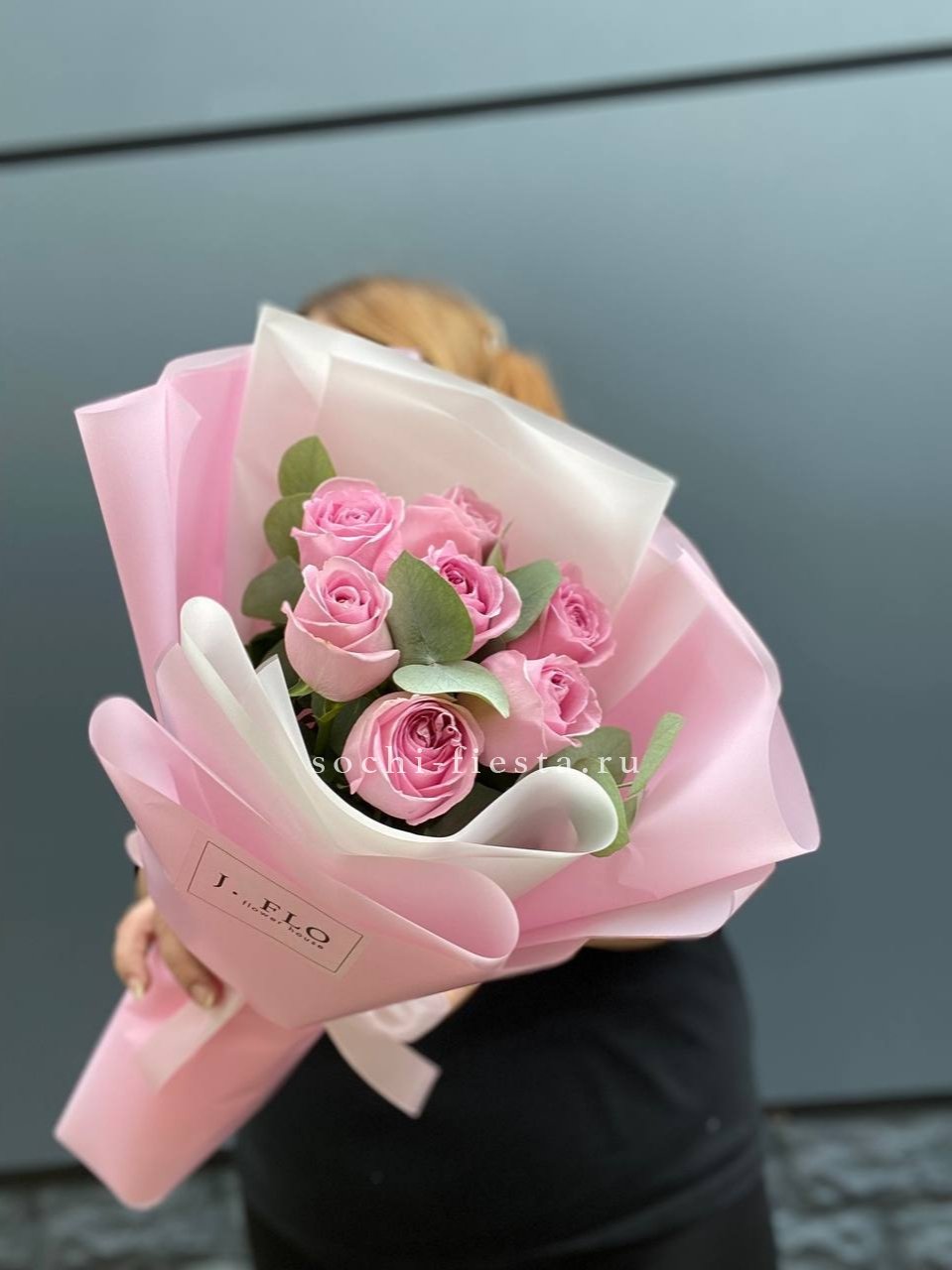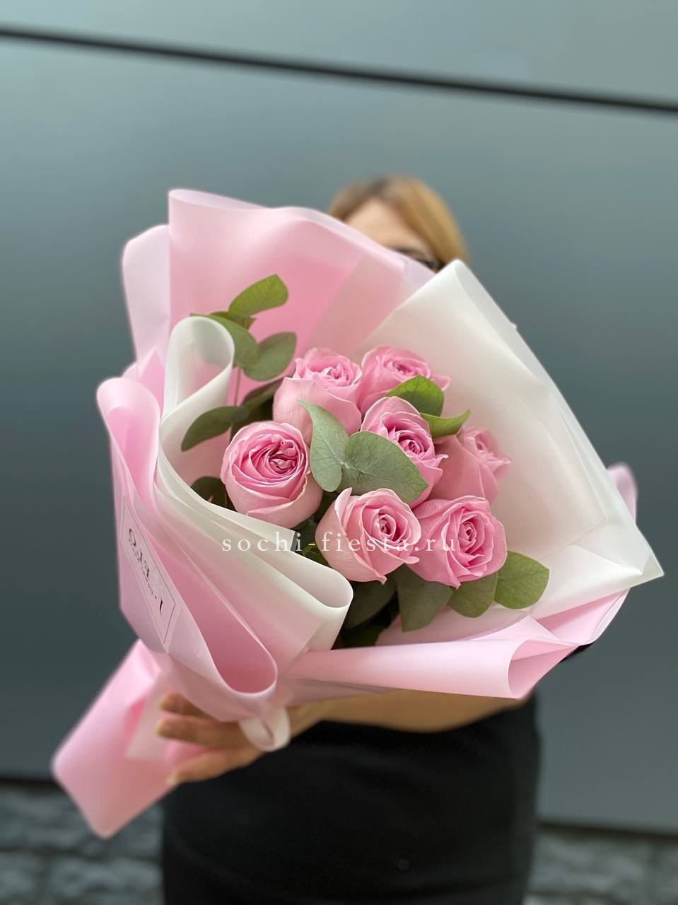 Одиннадцать французских роз выстроены в округлую композицию с веточками эвкалипта. Бутоны крупные и плотные, держат форму и наполняют пространство свежим присутствием.