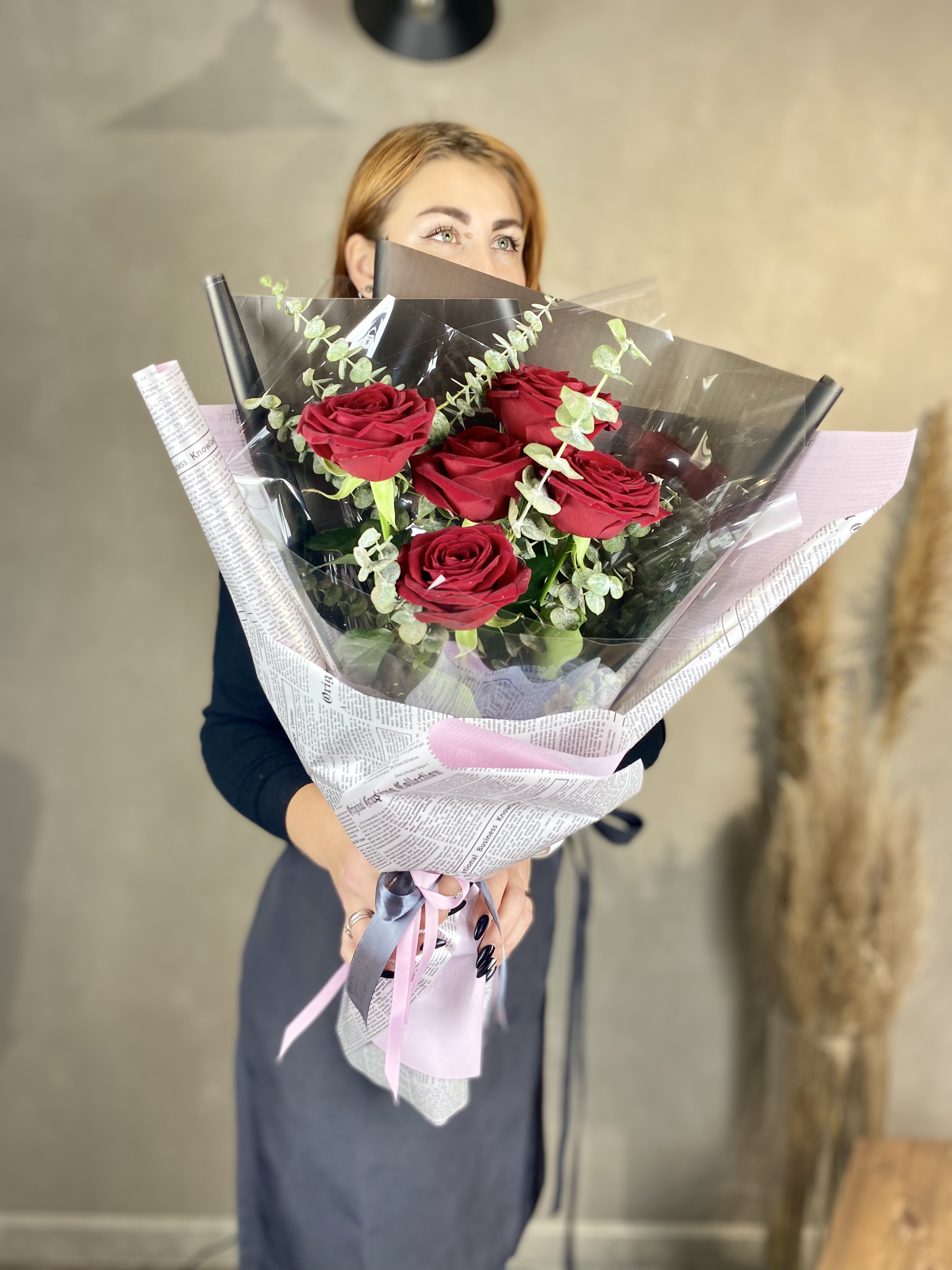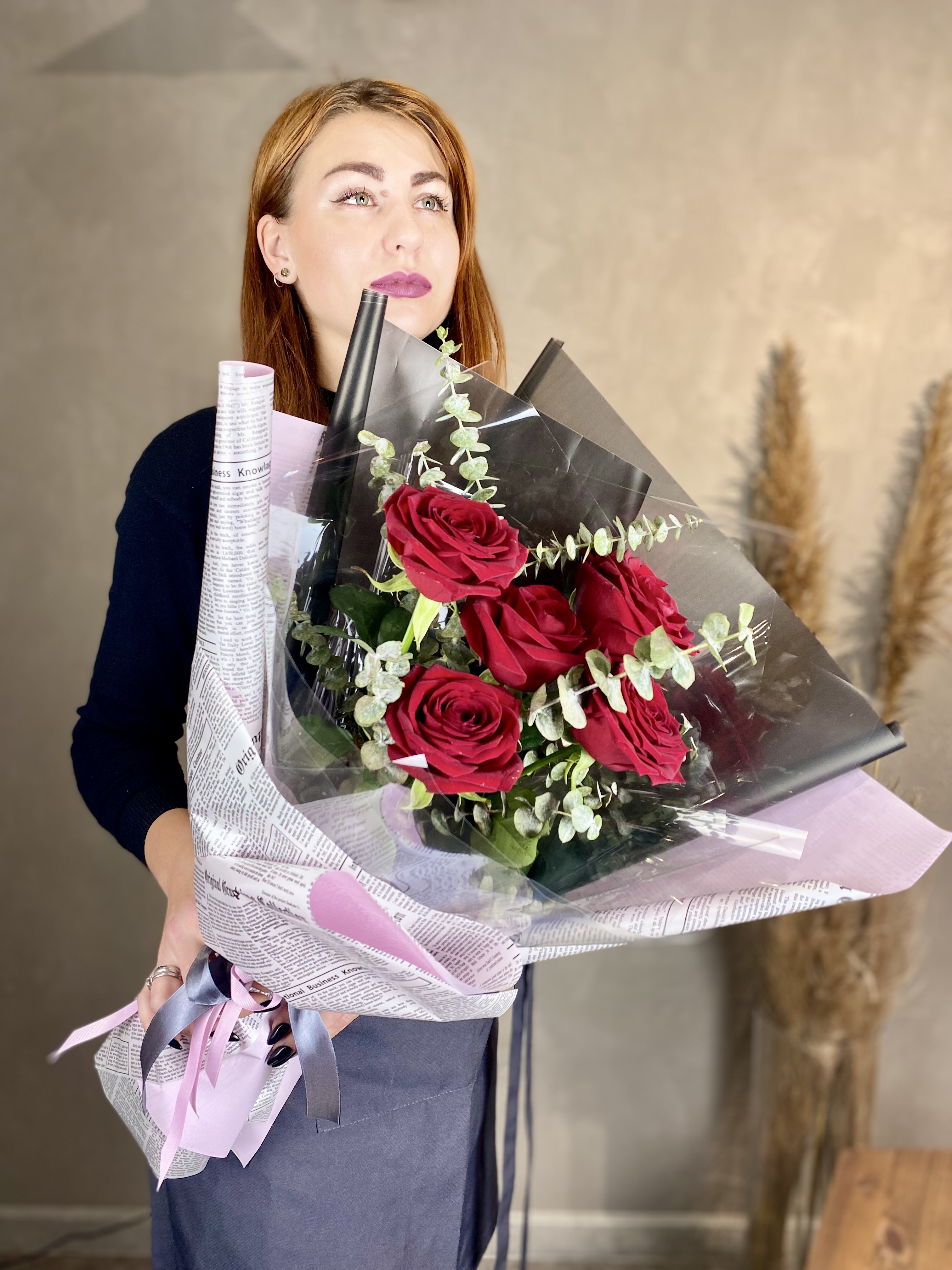 вывернутые красные розы, цилиндр D16, эвкалипт, лента, упаковка.