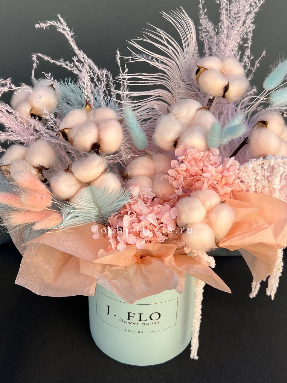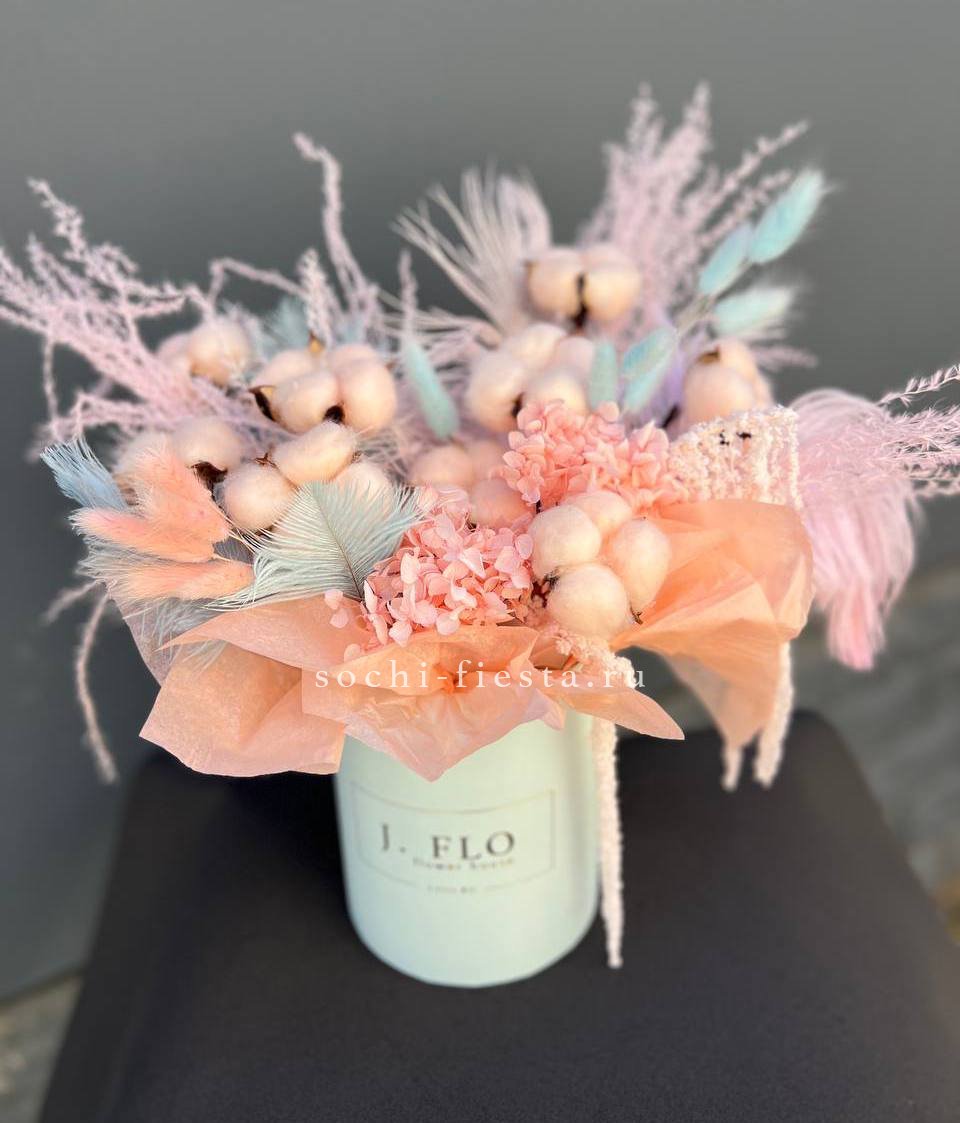 вывернутые розы, цилиндр D13, эвкалипт, лента, упаковка.