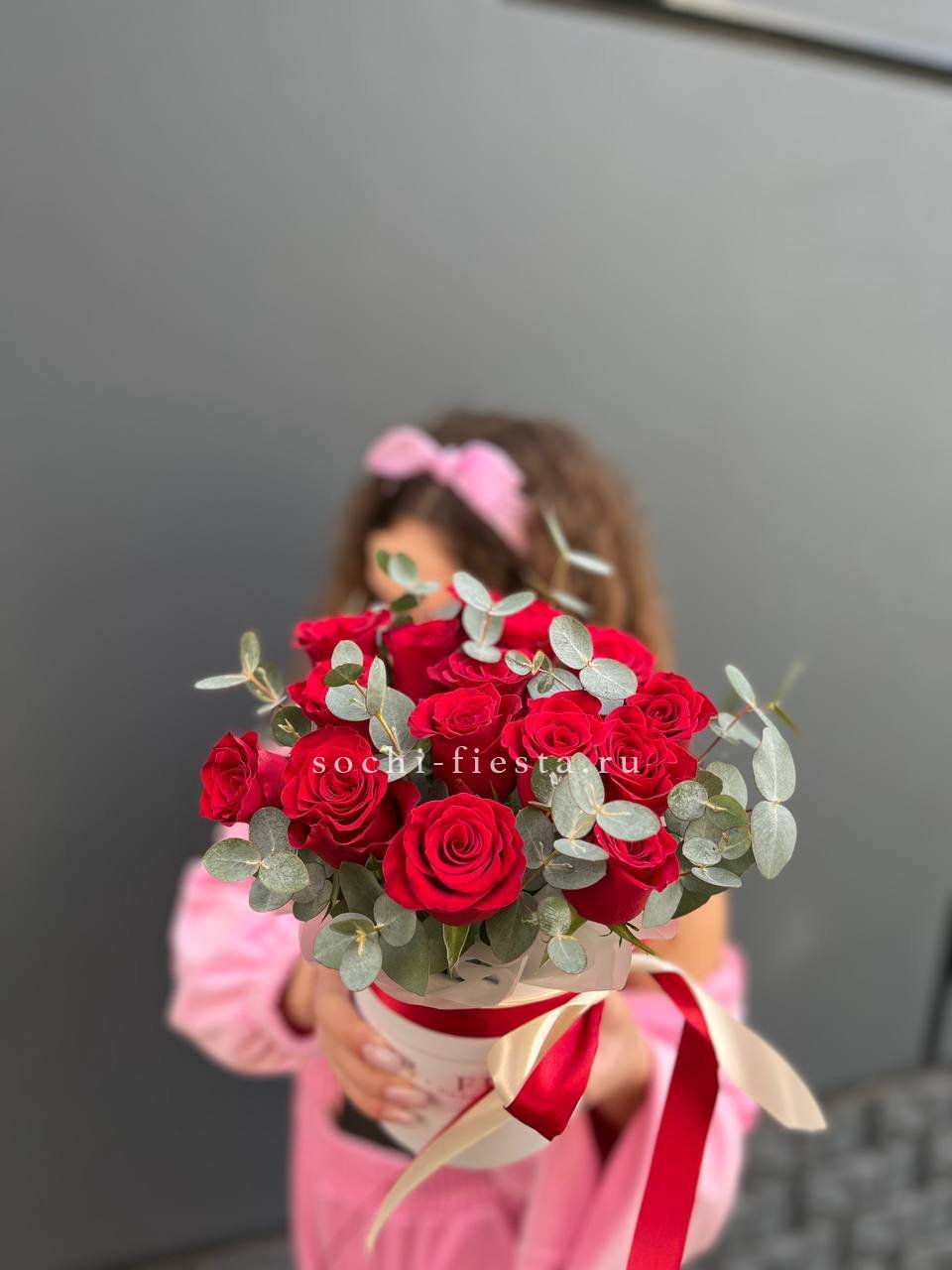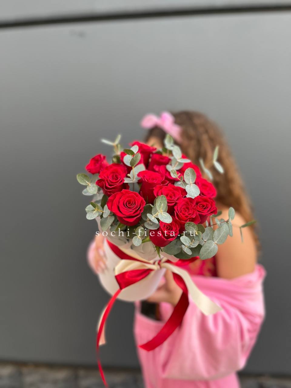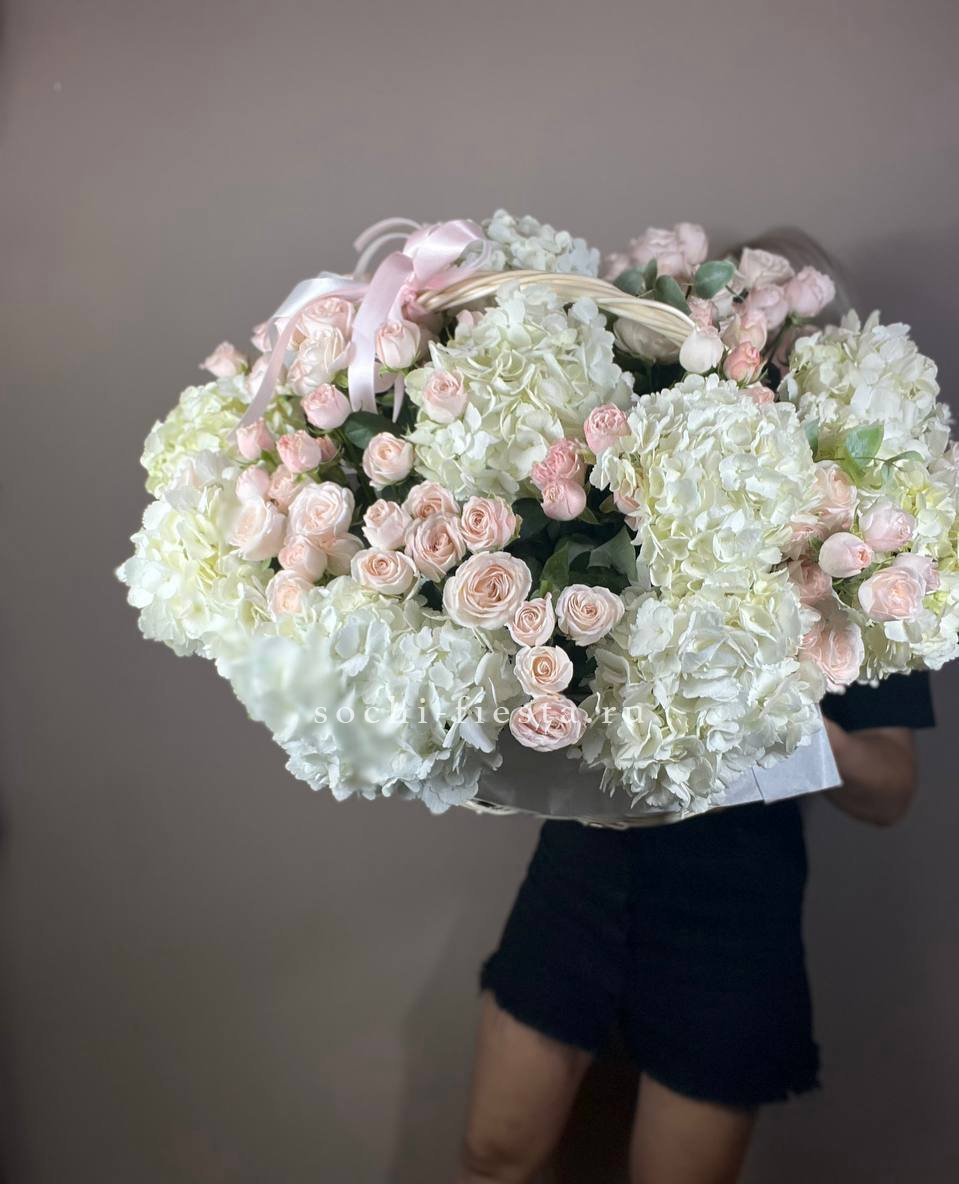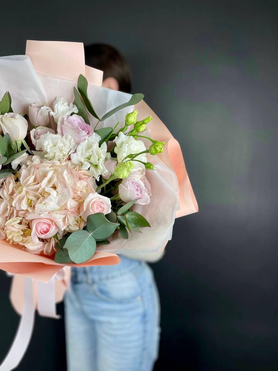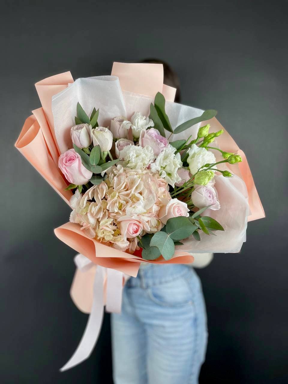 Пышная гортензия соседствует с крупными бутонами роз и многослойной эустомой. Веточки эвкалипта придают свежесть всей композиции. Букет с выразительным объемом и природной гармонией форм.
