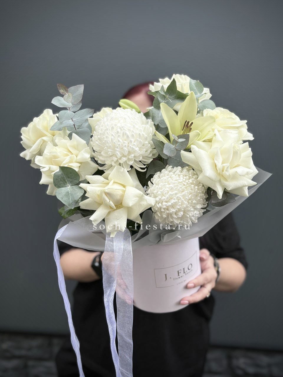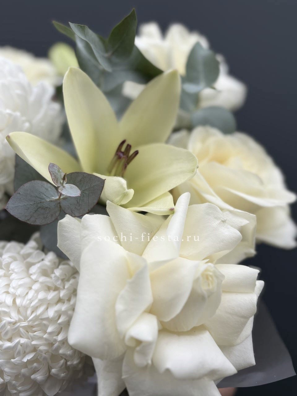 Густая многослойная композиция собрана из крупных бутонов Сара Бернар и белых роз. Гортензия заполняет объем, а эвкалипт создает воздушную окантовку по краям букета.
