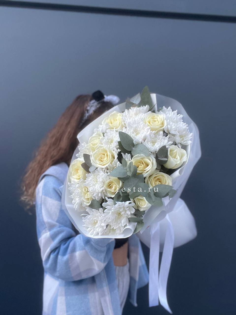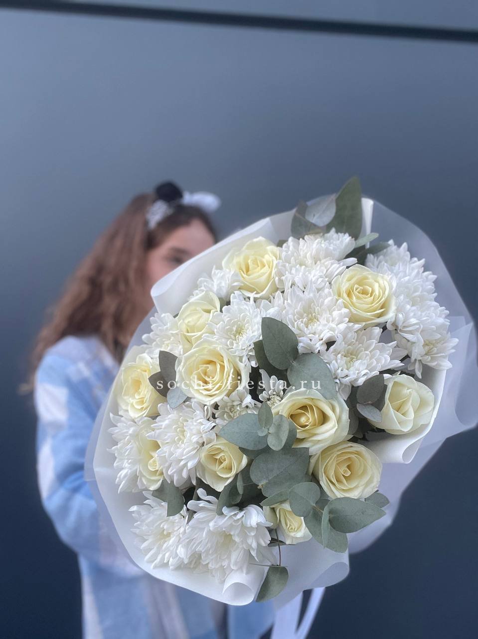 хризантема, эустома, озотамус, розы, хлопок в оформлении.