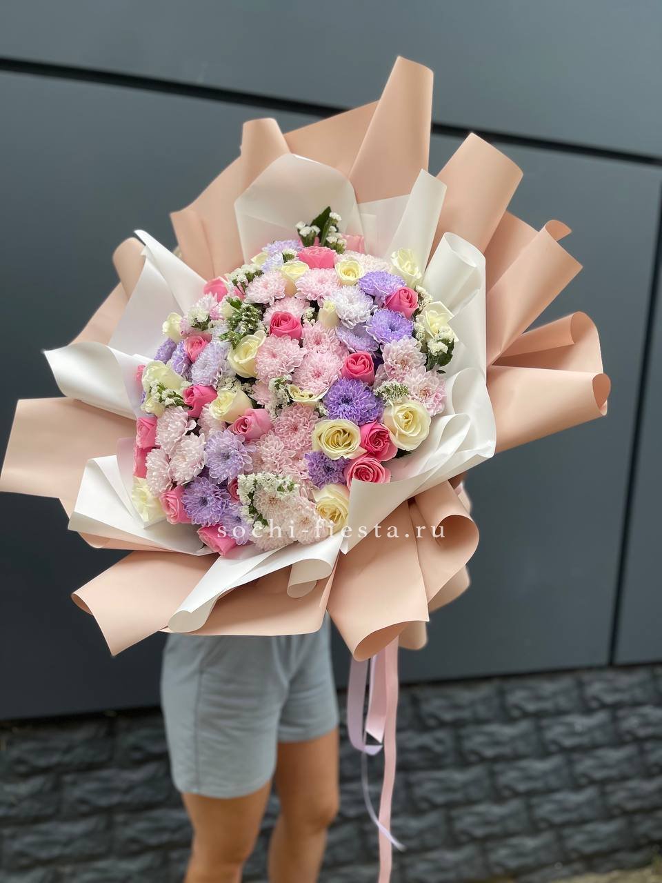 Розовые оттенки роз и эустомы переплетаются с яркой хризантемой в теплой композиции. Хлопок добавляет текстурной мягкости, а озотамус создает ажурную основу. Букет дарит радостное настроение и естественную красоту.
