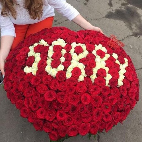 Пятьсот пятьдесят пять роз выстраиваются в форме сердца, где белый и розовый переходят друг в друга волнами. Каркас удерживает масштабную композицию, превращая цветы в архитектурный объект.