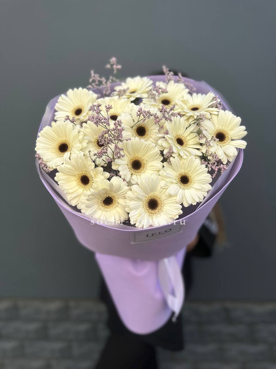 Голландские герберы сорта Solare дополнены воздушным лимониумом, который создаёт лёгкую дымку вокруг ярких головок. Дизайнерская упаковка завершает композицию, удобную для размещения в любом интерьере.