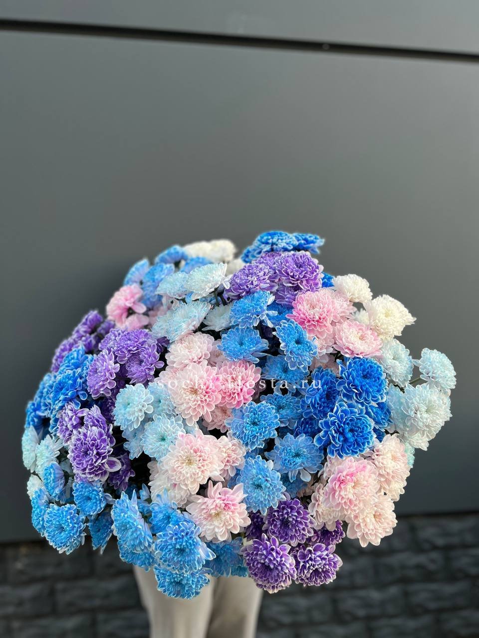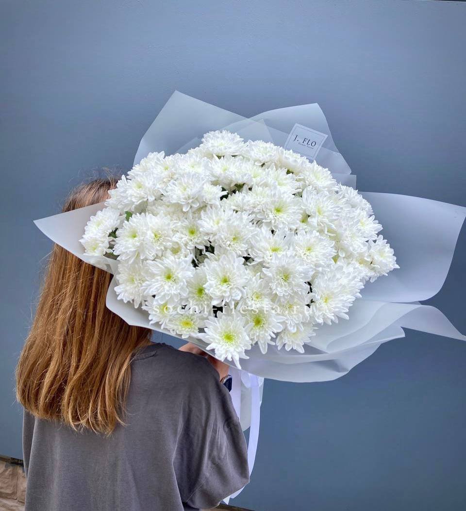 Двадцать пять веток кустовой хризантемы в миксе оттенков образуют живописное полотно. Каждый цвет звучит самостоятельно и при этом перетекает в соседний, создавая динамичную композицию.