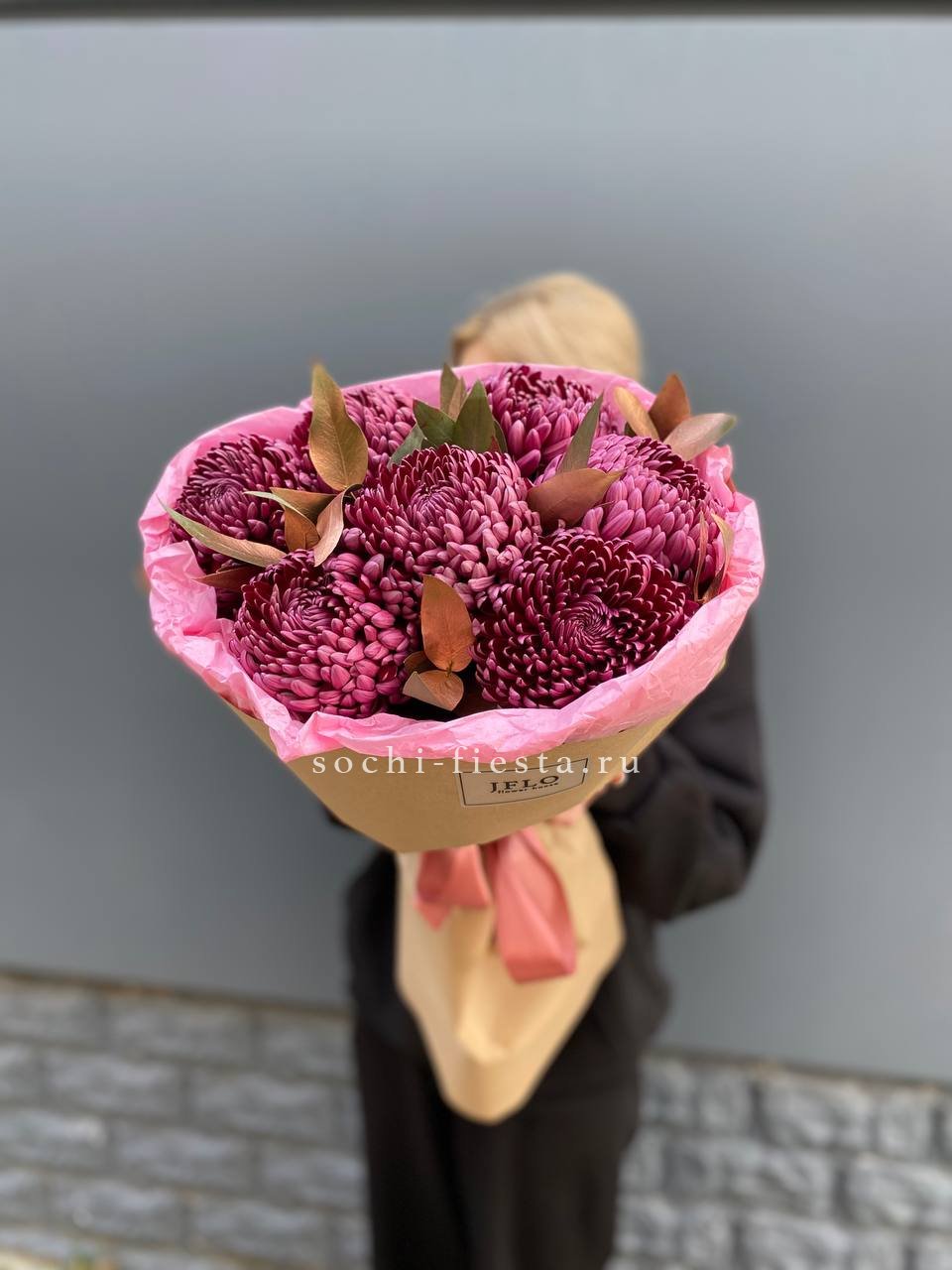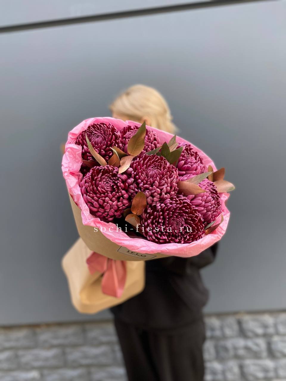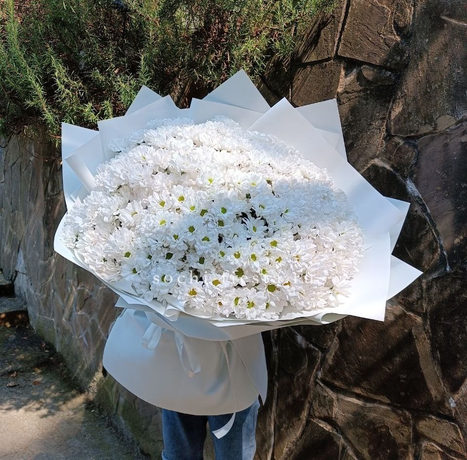 Семь пышных соцветий хризантемы с игривыми завитыми лепестками собраны в плотную композицию. Золотистый эвкалипт добавляет теплое мерцание и завершает образ. Яркий жест для тех, кто любит выразительные формы и живую энергию цветов.