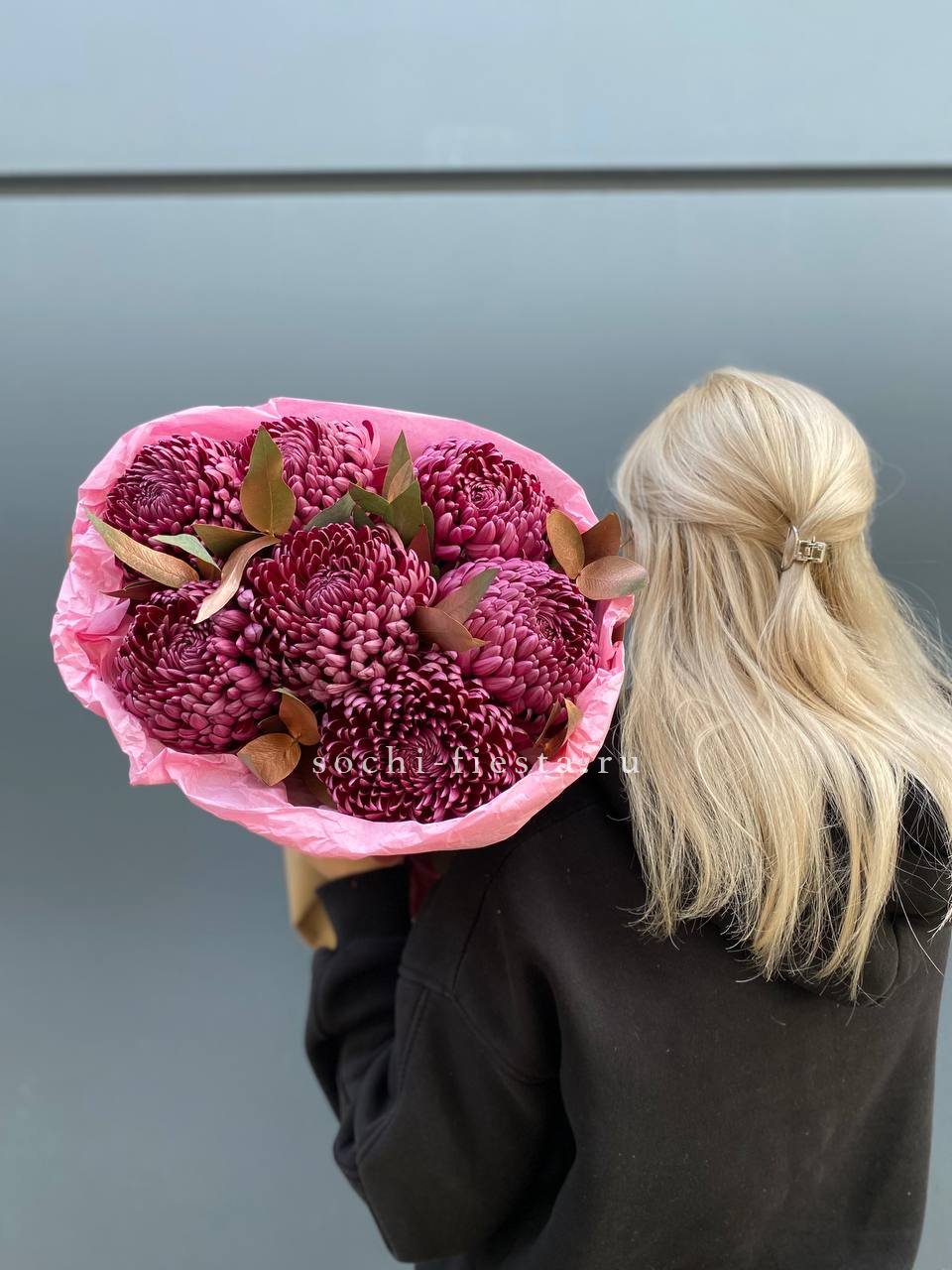 хризантема бигуди с золотым эвкалиптом в оформлении.