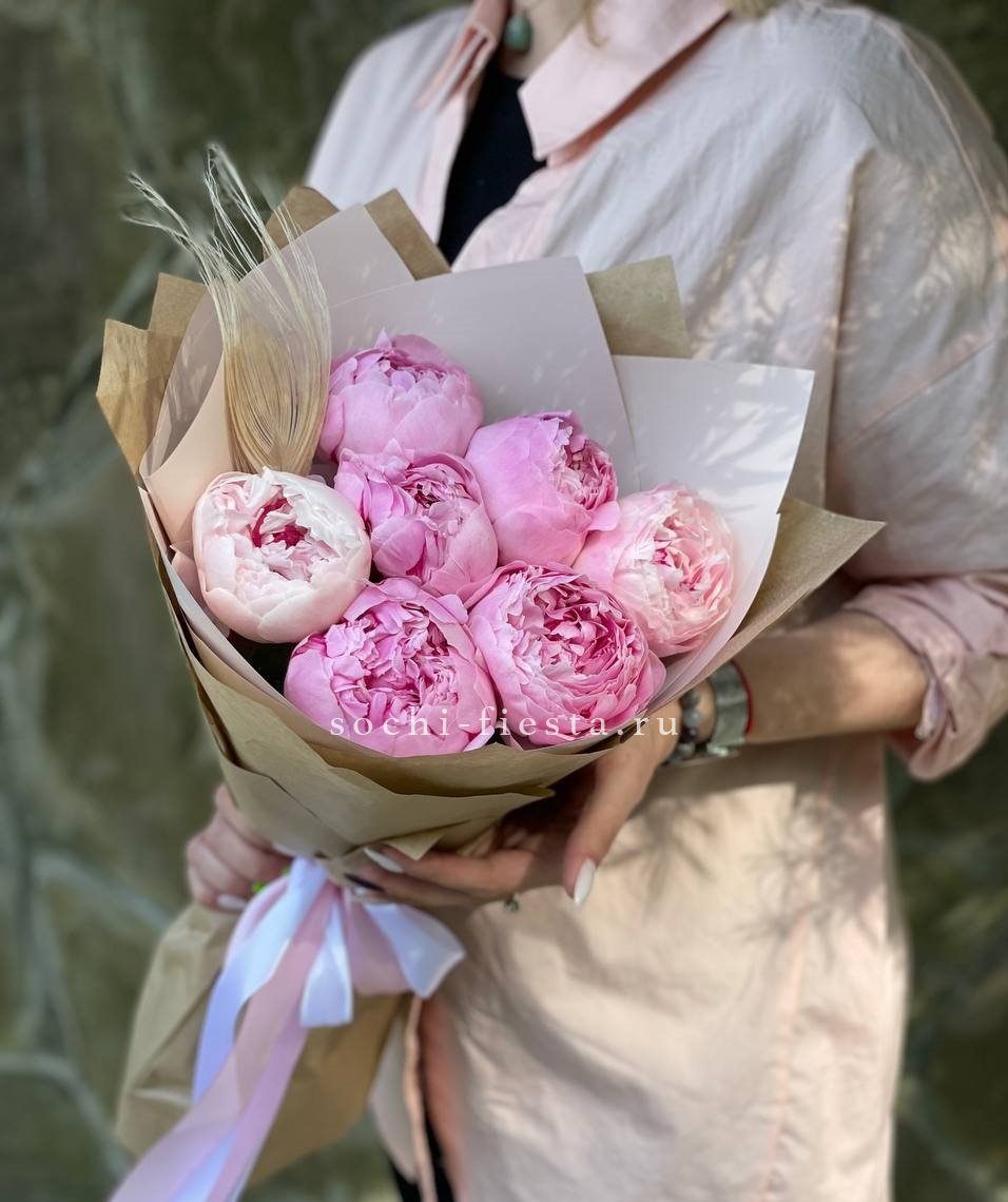 Семь пионов Сара Бернар собраны в компактную композицию с лёгким декоративным акцентом. Крафт и светлая плёнка подчёркивают естественную красоту раскрывающихся бутонов.