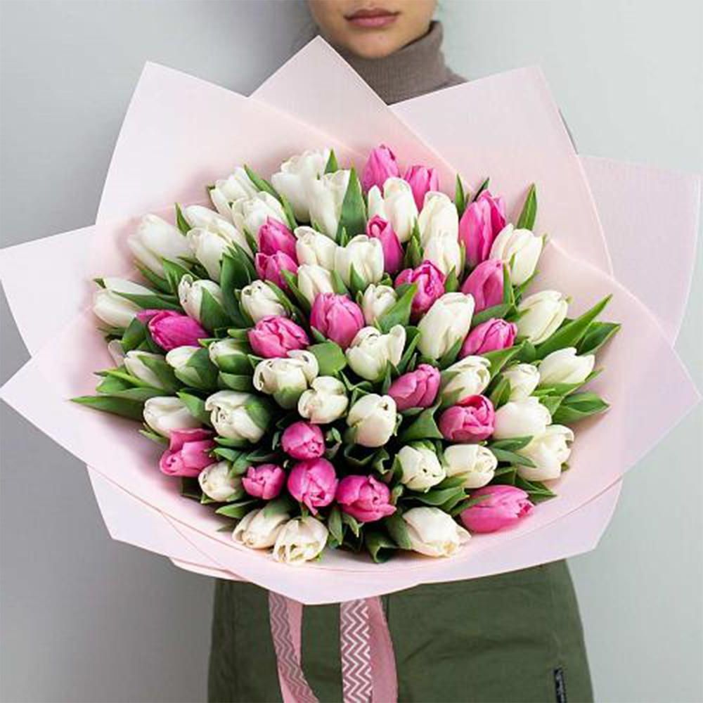 Шестьдесят один тюльпан в бело-розовых тонах создаёт воздушное цветовое впечатление с мягкими переходами. Букет наполняет пространство светом и лёгкостью.