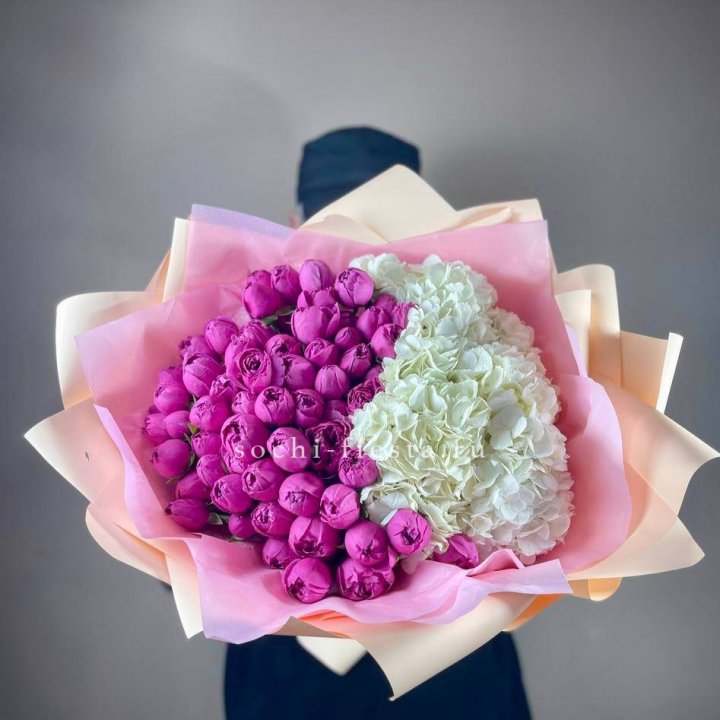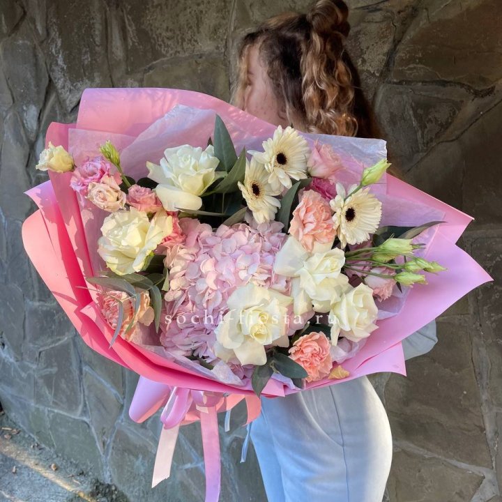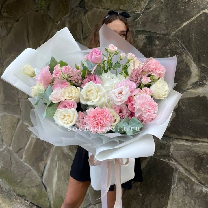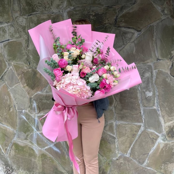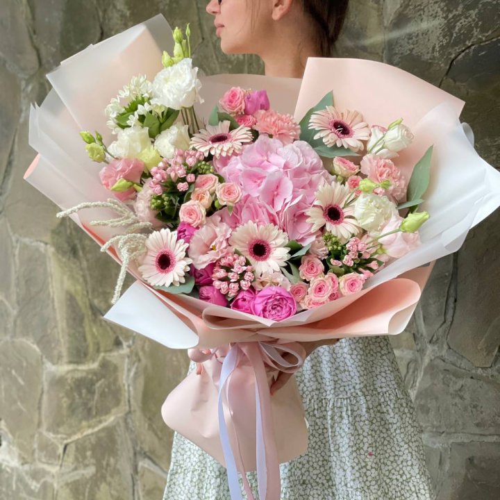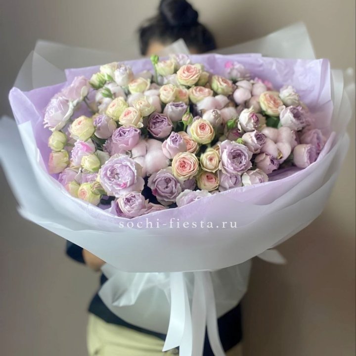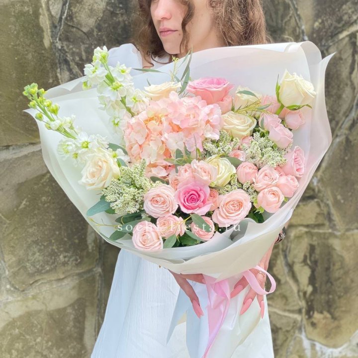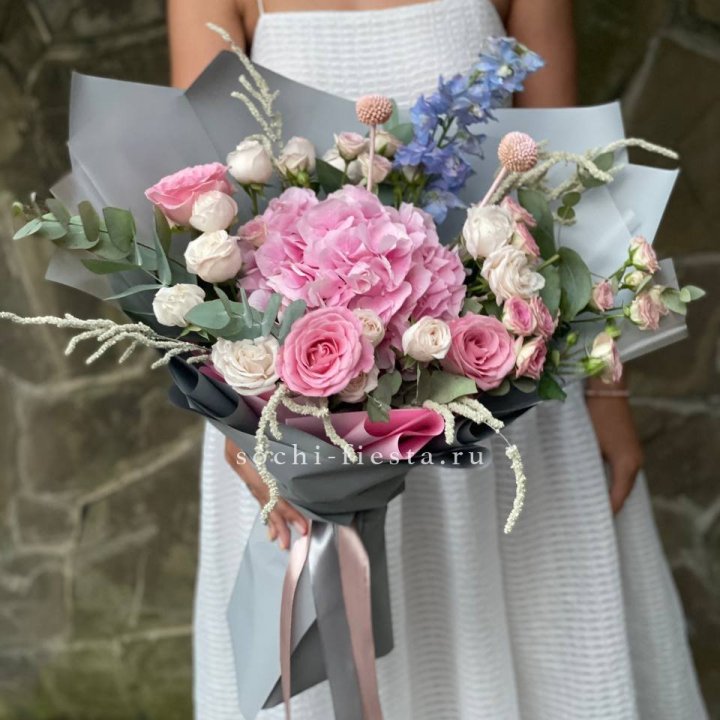 Материал авторских ростовских букетов определяется доступными поставками и сезоном. David Austin розы: Juliet, Keira, Miranda — из московских аукционов. Ранункулюс в марте-апреле. Пионы в мае-июне: кубанские и тепличные. Анемоны и нигелла в сезон. Клематис, амаранто. Летом — полевые и садовые цветы с кубанских хозяйств: дельфиниум, астранция, нигелла, наперстянка. Флорист строит авторский букет из того, что сейчас в пике кондиции.
