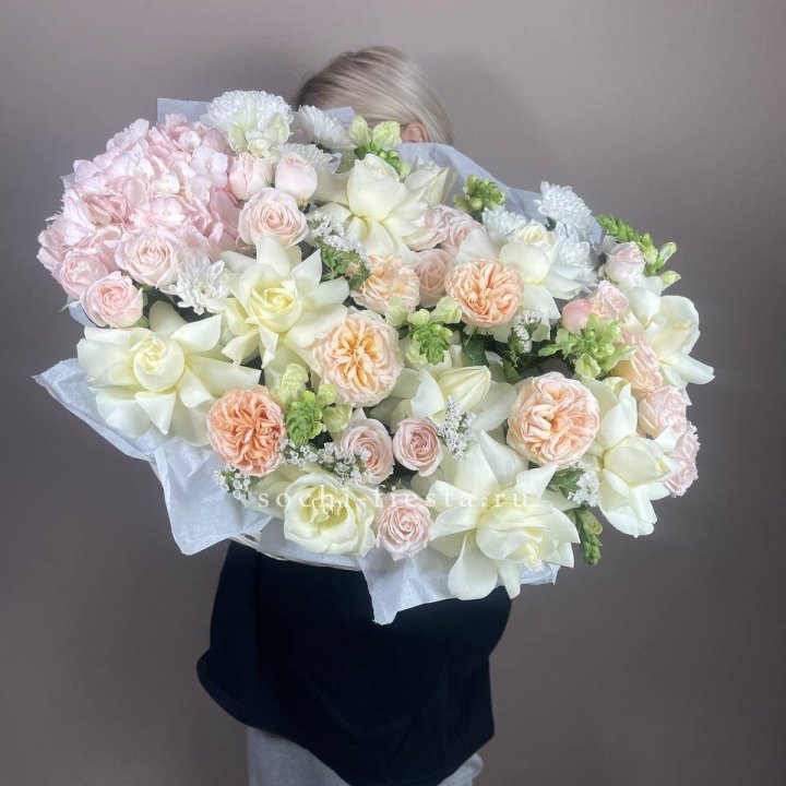 - Редкий состав — David Austin, ранункулюс, анемоны, дельфиниум, клематис.