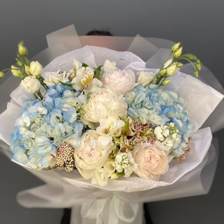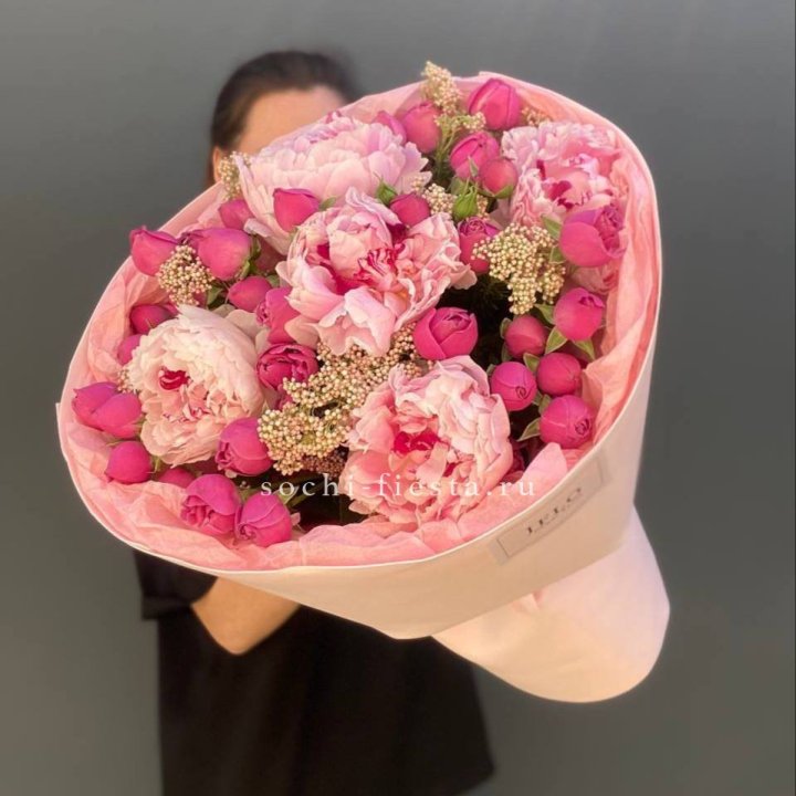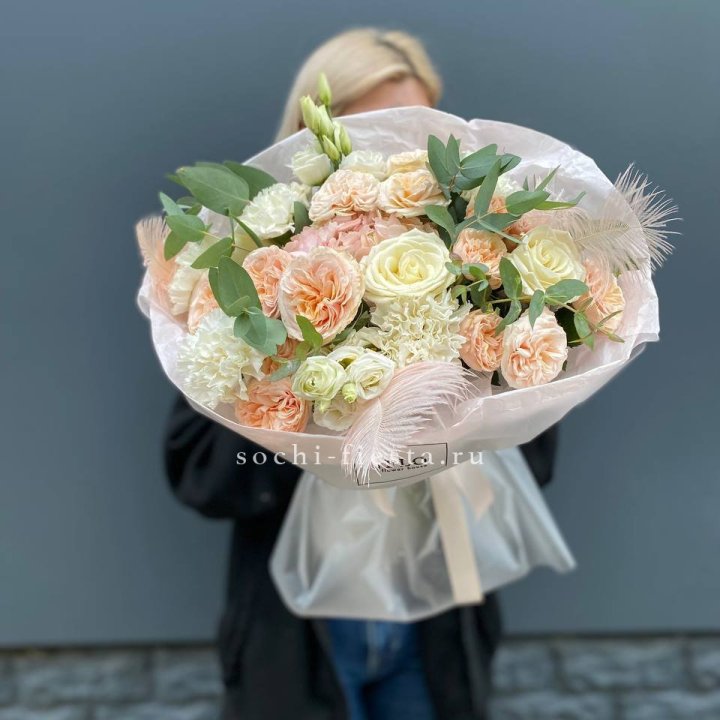 Материал авторских ростовских букетов определяется доступными поставками и сезоном. David Austin розы: Juliet, Keira, Miranda — из московских аукционов. Ранункулюс в марте-апреле. Пионы в мае-июне: кубанские и тепличные. Анемоны и нигелла в сезон. Клематис, амаранто. Летом — полевые и садовые цветы с кубанских хозяйств: дельфиниум, астранция, нигелла, наперстянка. Флорист строит авторский букет из того, что сейчас в пике кондиции.