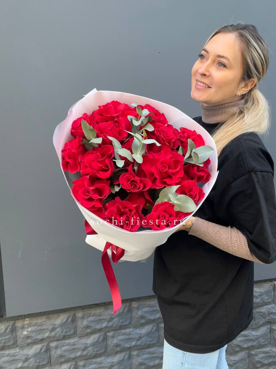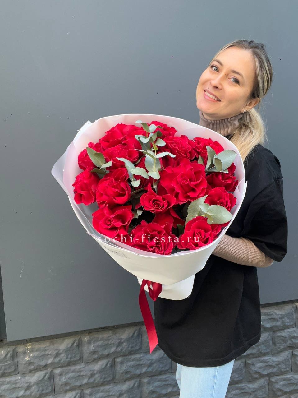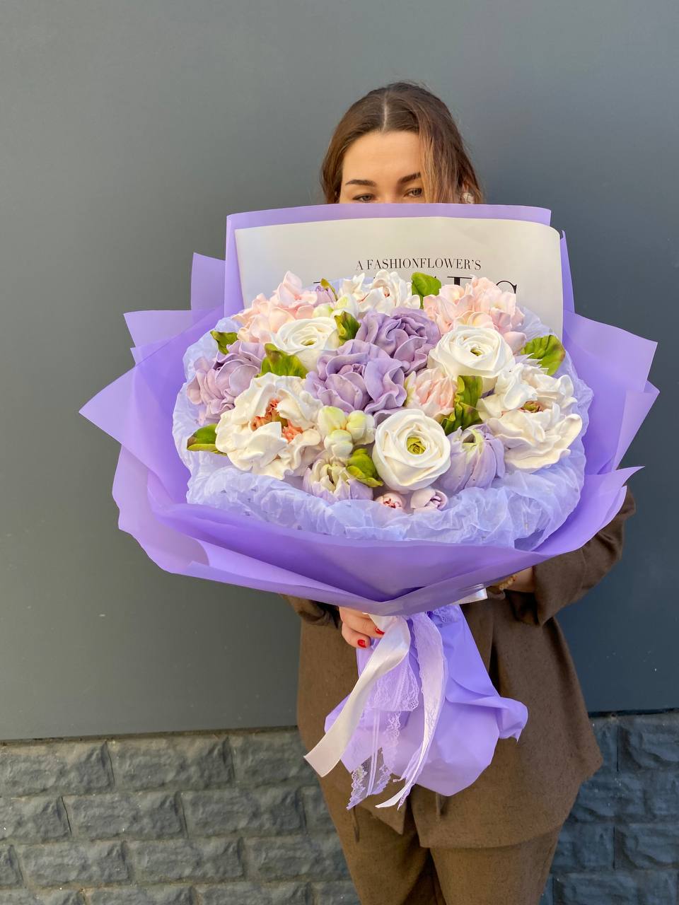 Плотная сборка из роз и хризантем с волнами маттиолы создает густую текстуру. Эвкалипт добавляет графику, а авторская упаковка завершает форму. Букет держит объем и выглядит цельно.