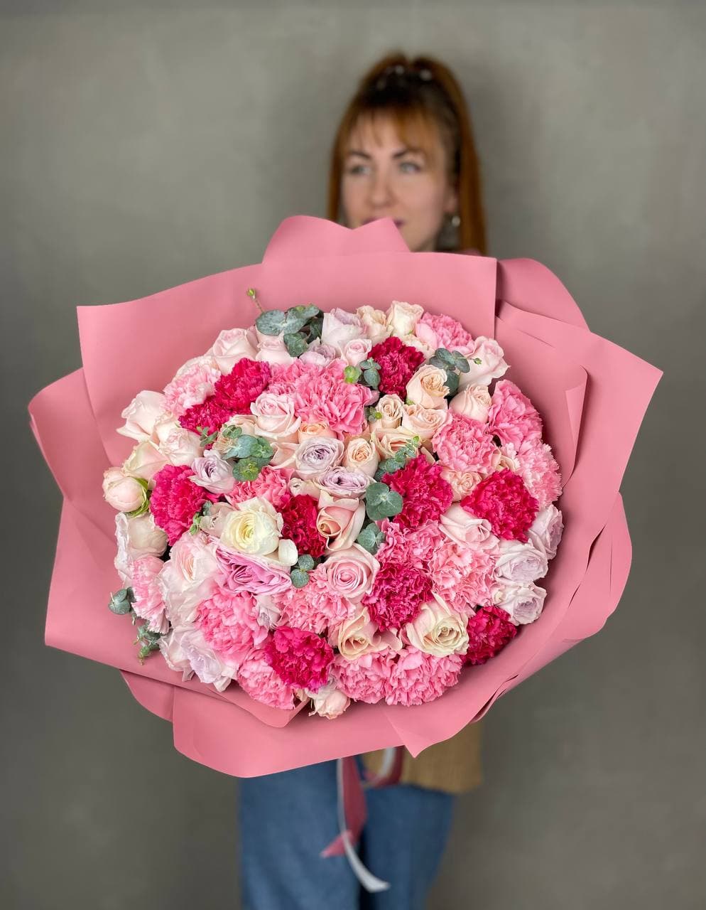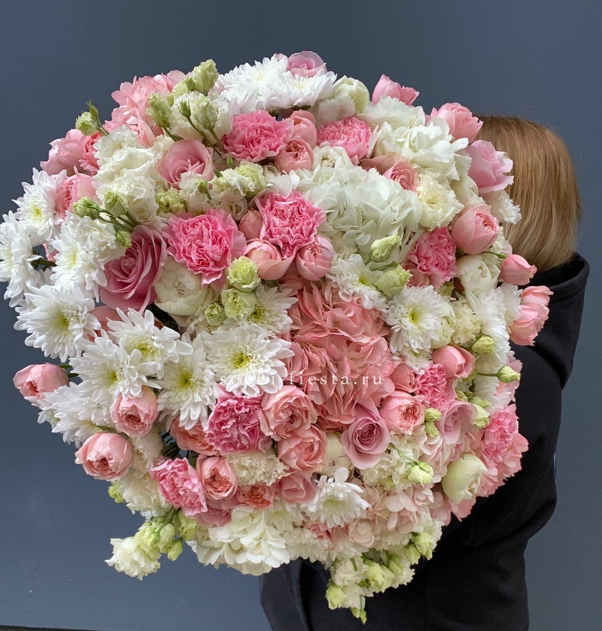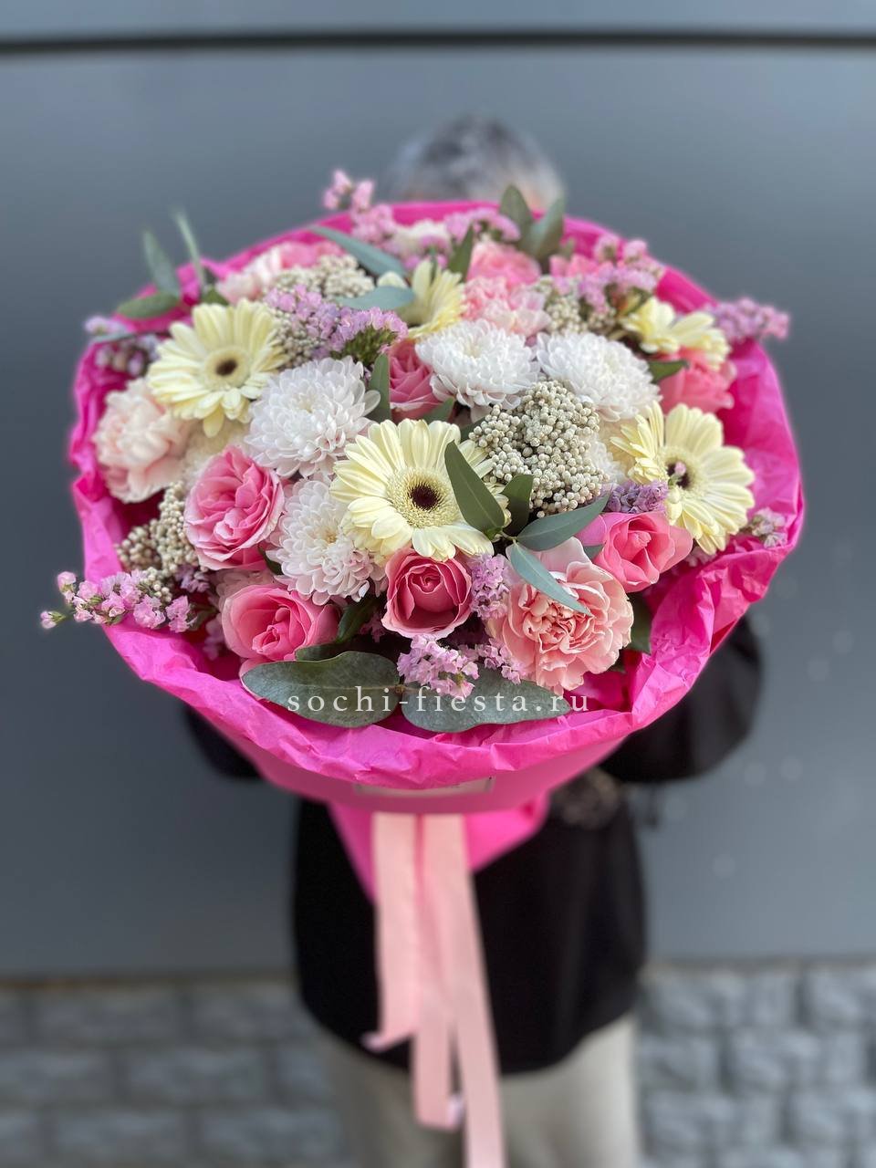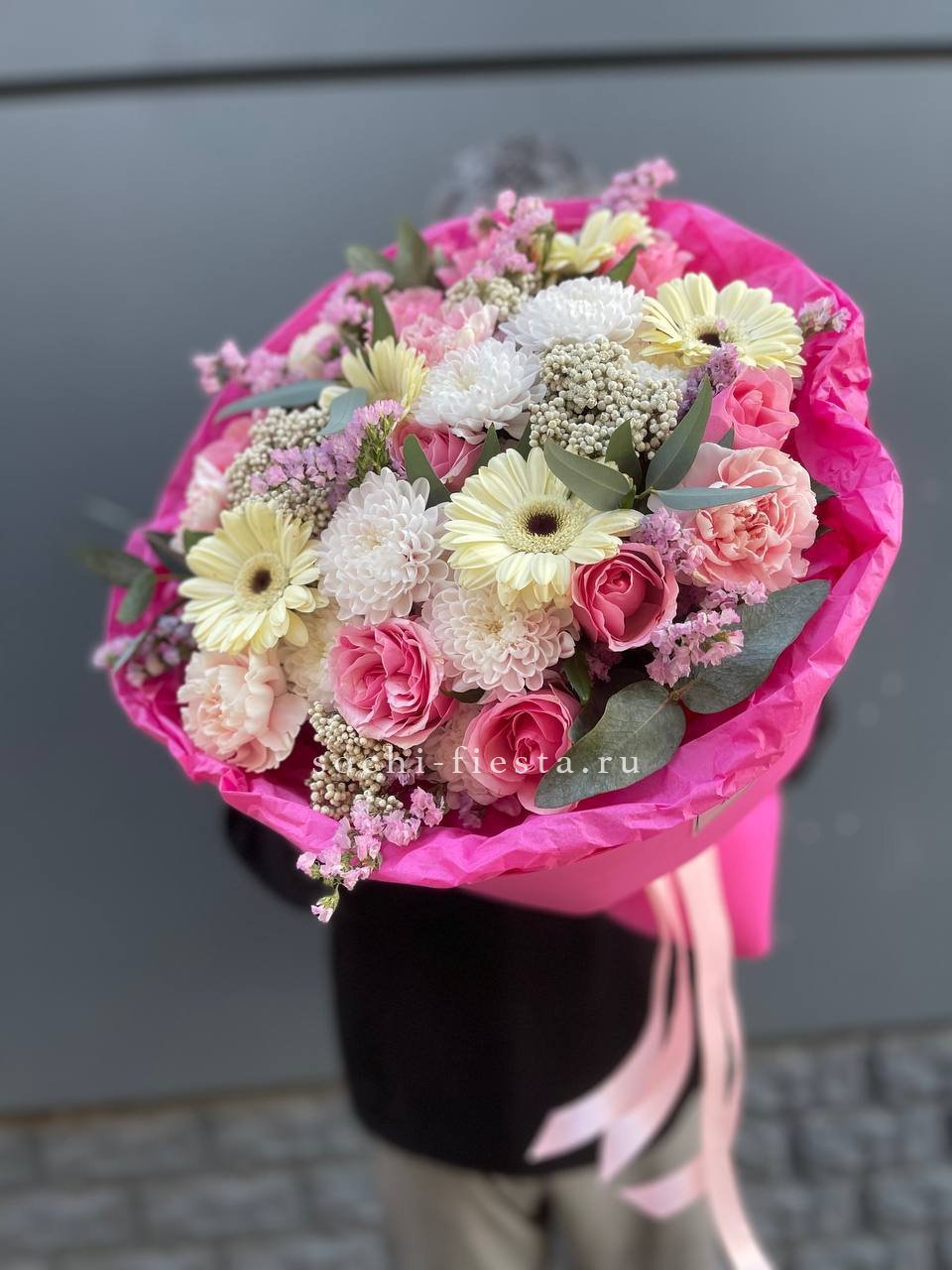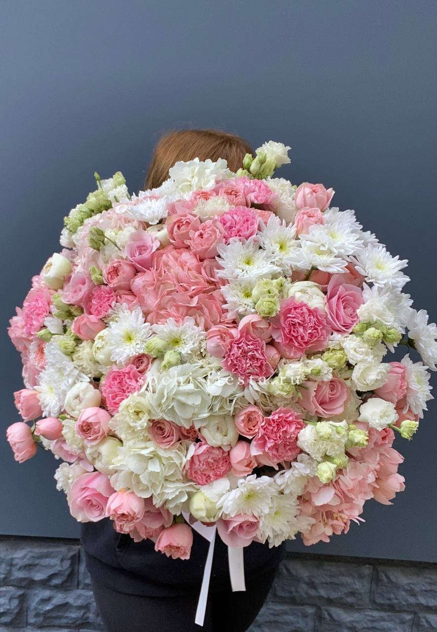 гортензия, диантус, мисти бабблс, астильба или аналог, гербера, кустовая роза, бовардия, эустома, эвкалипт, авторская упаковка, лента.