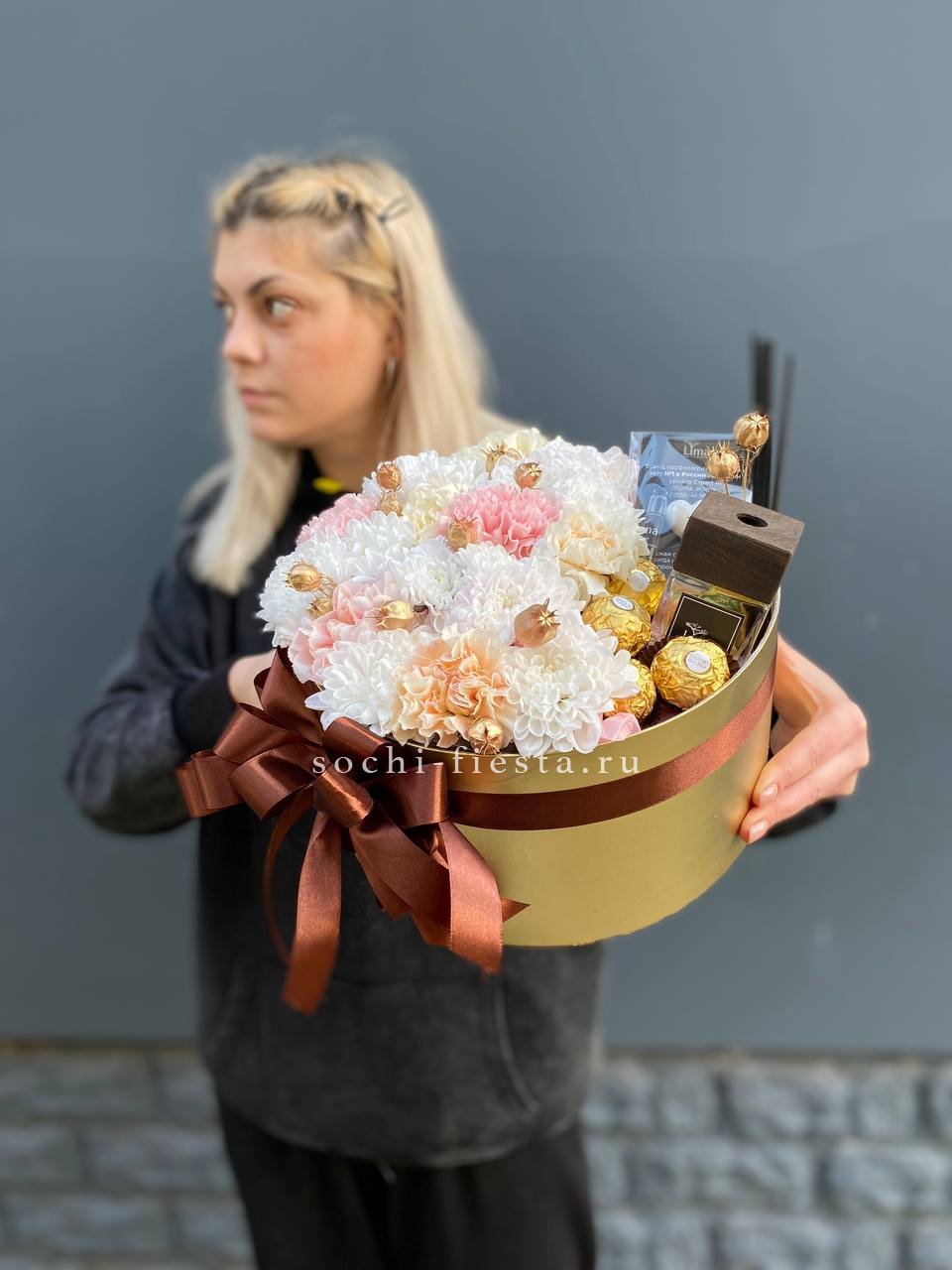 Композиция объединяет живые хризантемы и диантусы с ароматическим диффузором. Цветы сохраняют свежесть долго, а аромат наполняет пространство мягким шлейфом.