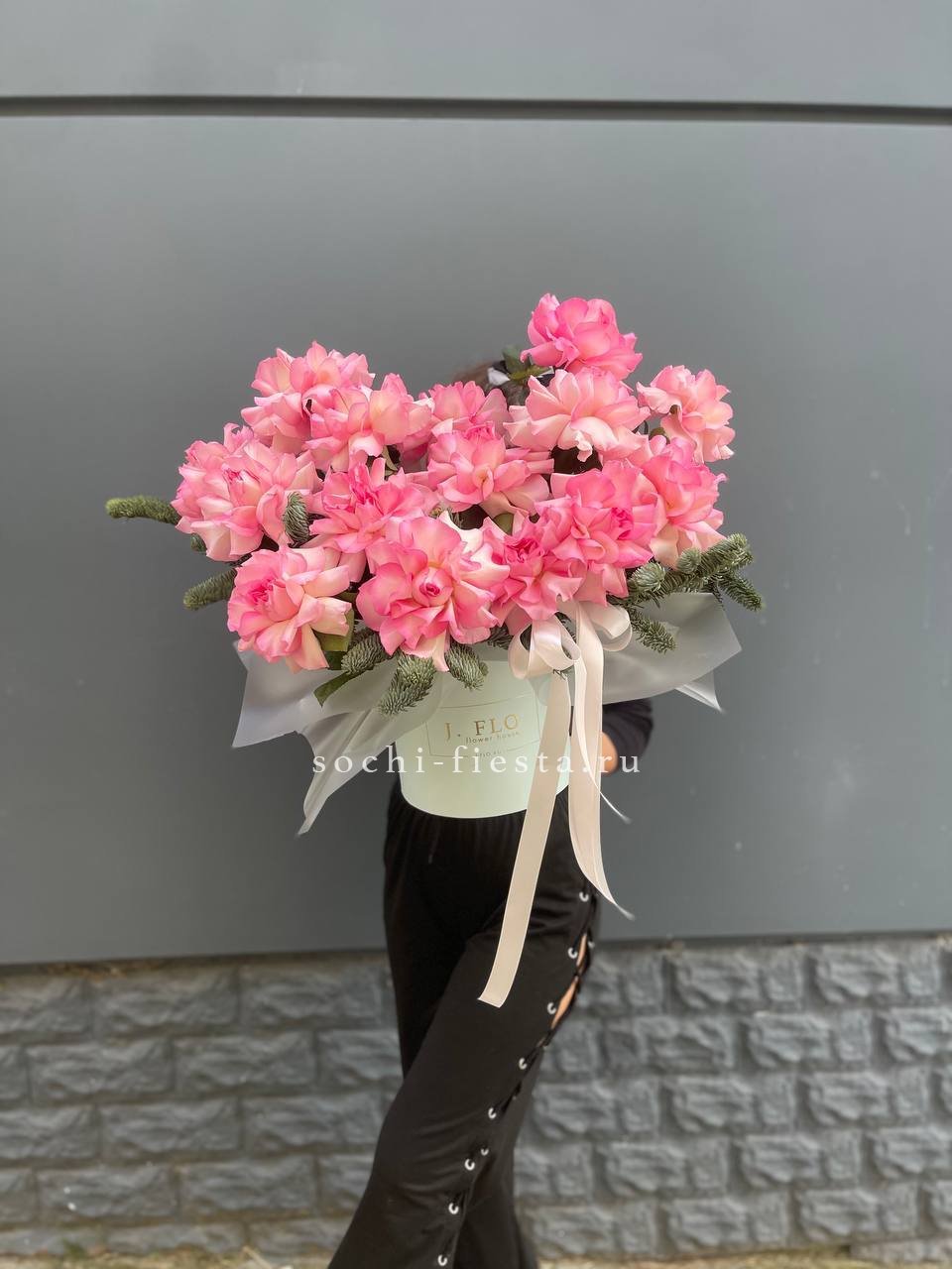 Пятнадцать роз Мандала в боксе образуют плотную шапку с густыми многослойными бутонами. Нобилис добавляет фактурную глубину и завершает композицию.