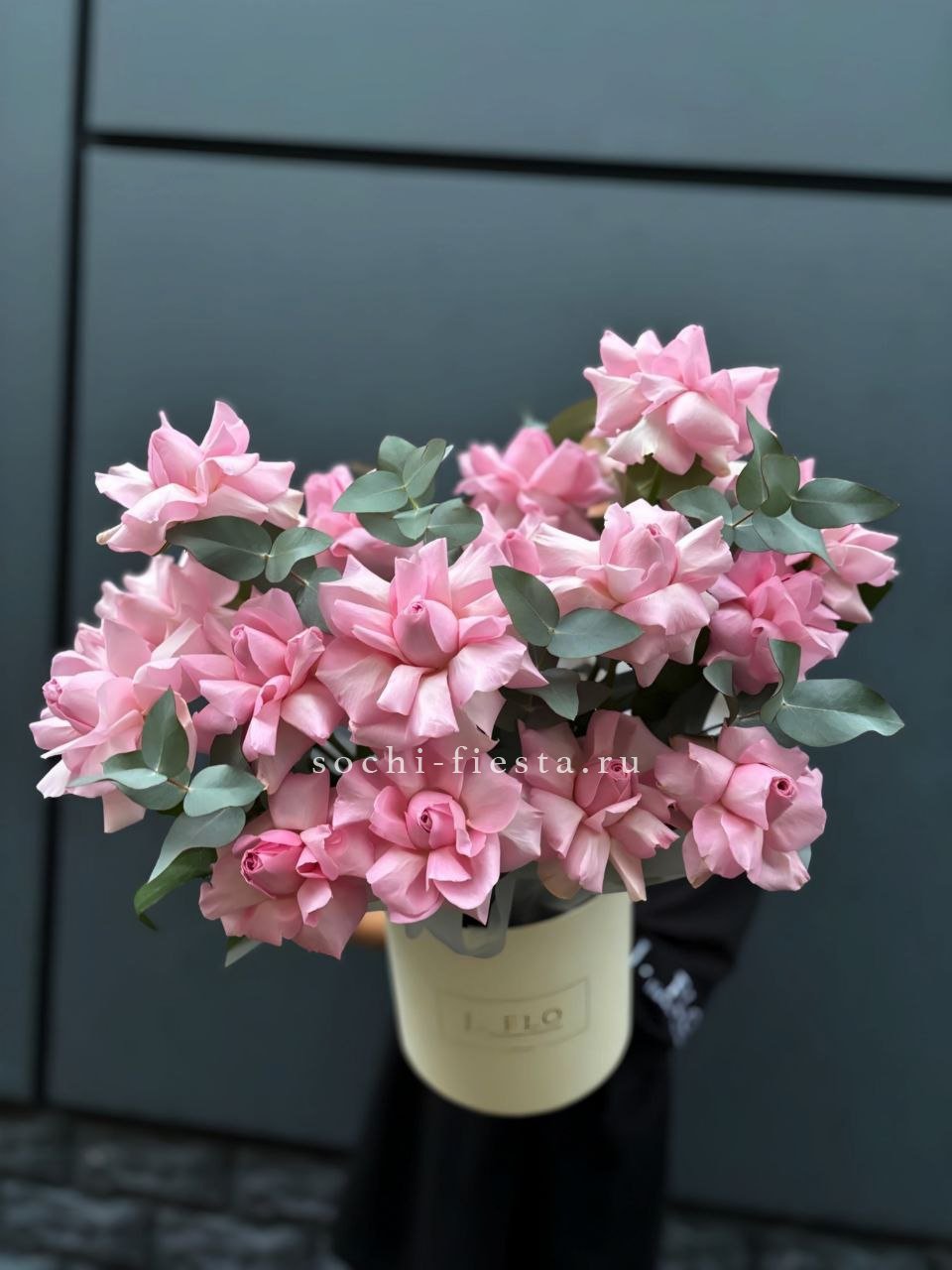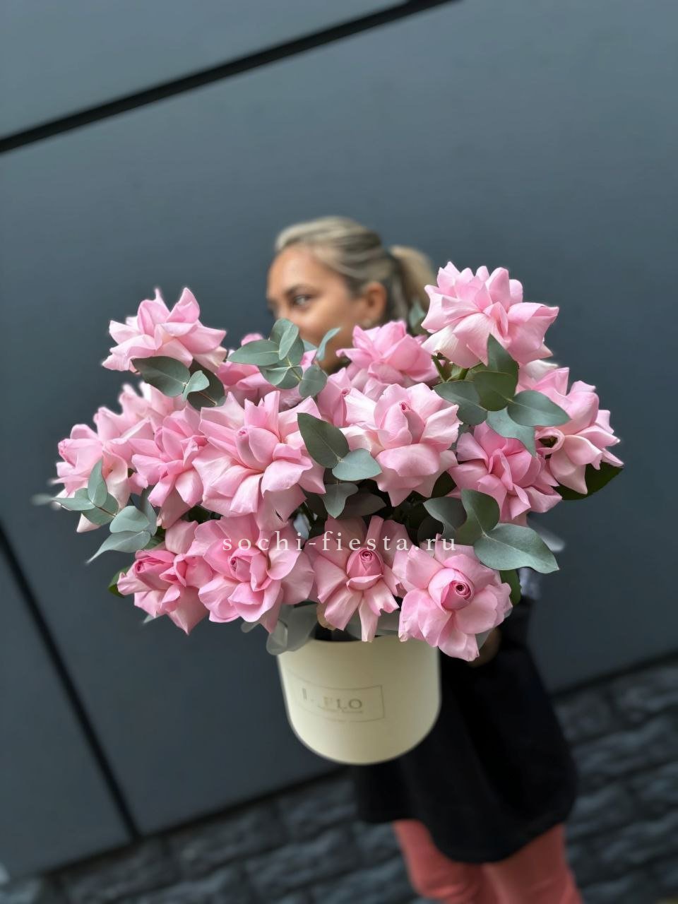 вывернутые белые розы, цилиндр D20, эвкалипт, лента, упаковка.