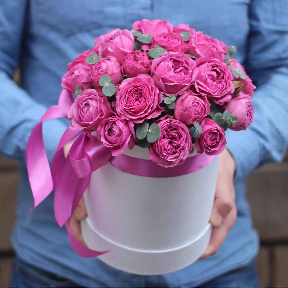 роза кустовая, эустома, диантус,  эвкалипт, 5 макаронс, белый цилиндр D15 Цвет коробки может быть согласован с клиентом.  Наполнение может меняться по наличию.