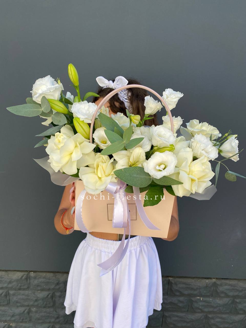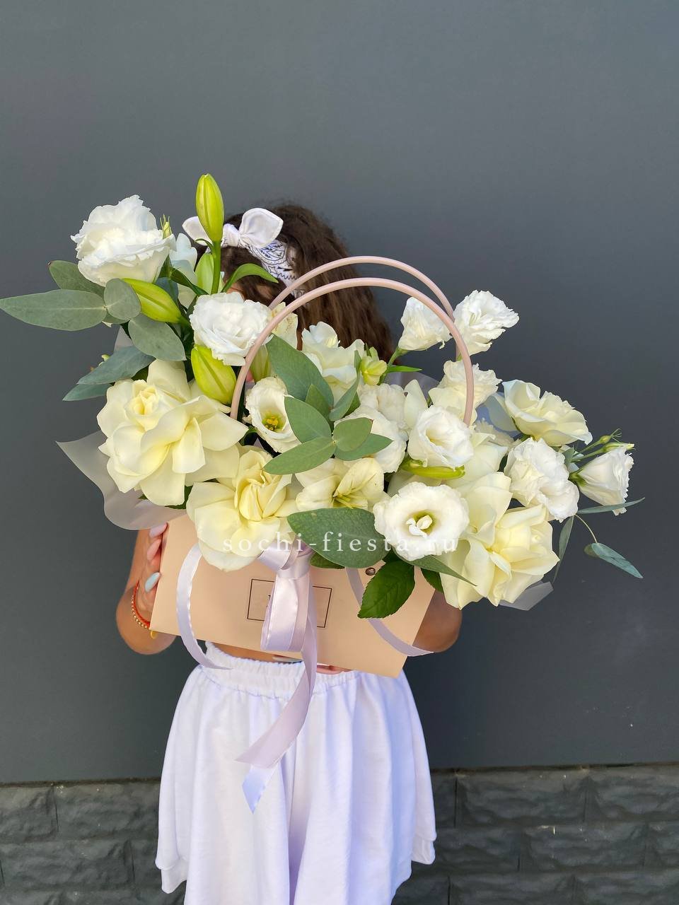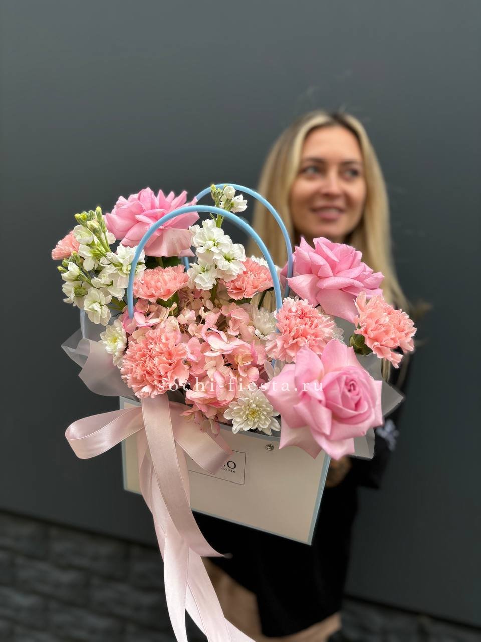 Пастельная гамма роз и гортензий переплетается с воздушной маттиолой и мелкими диантусами. Сумочка объединяет разные по фактуре бутоны в единую гармоничную форму.