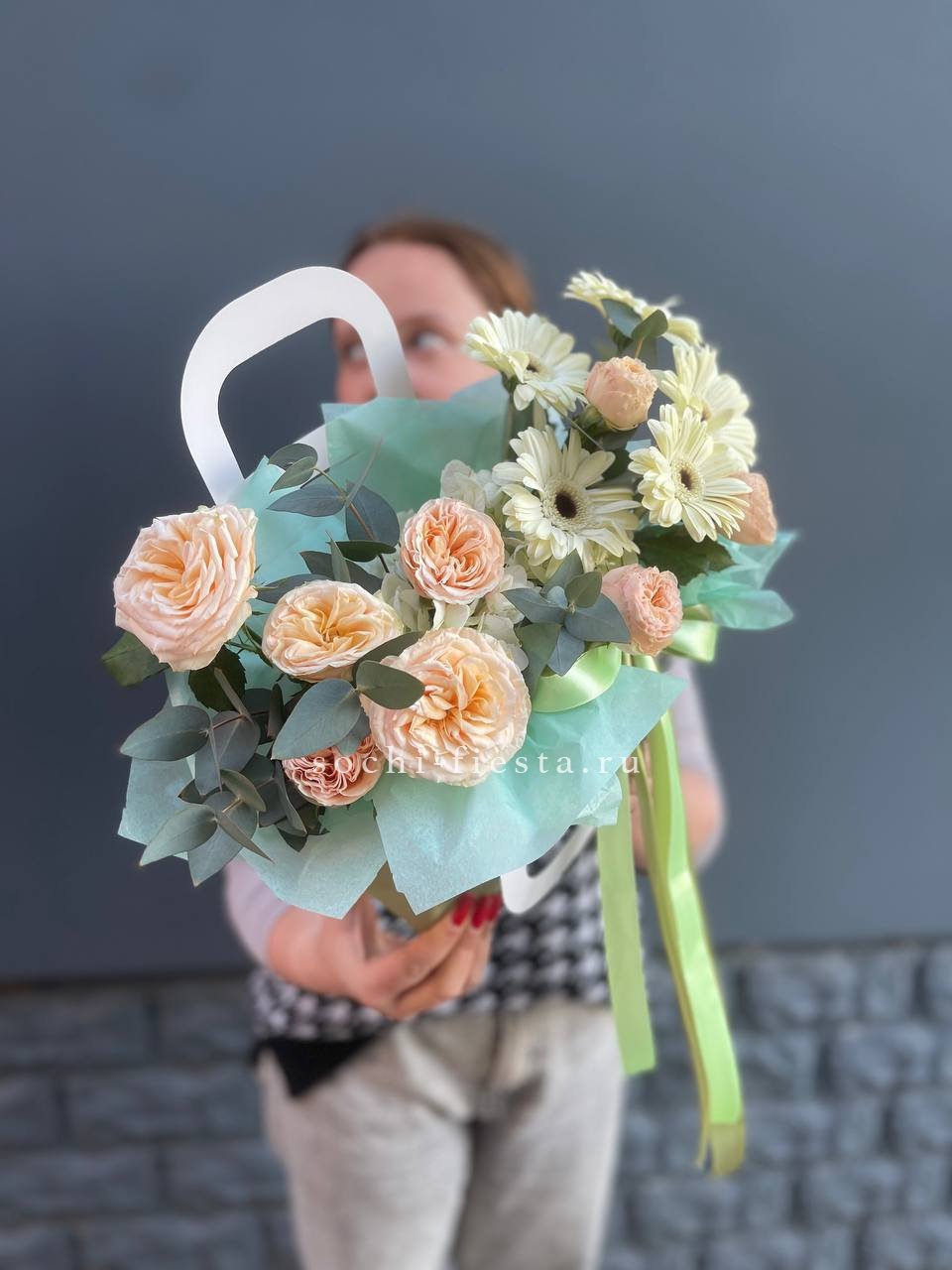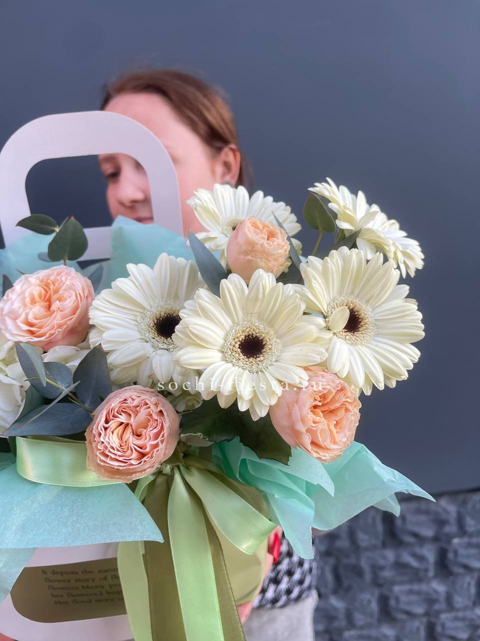 сумочка из гортензии, кустовой розы, герберы и эвкалипта.