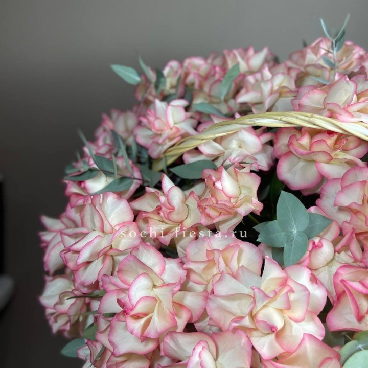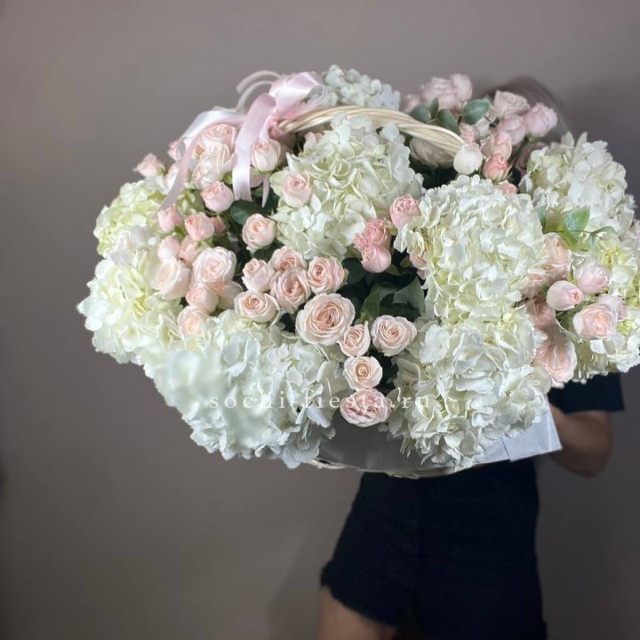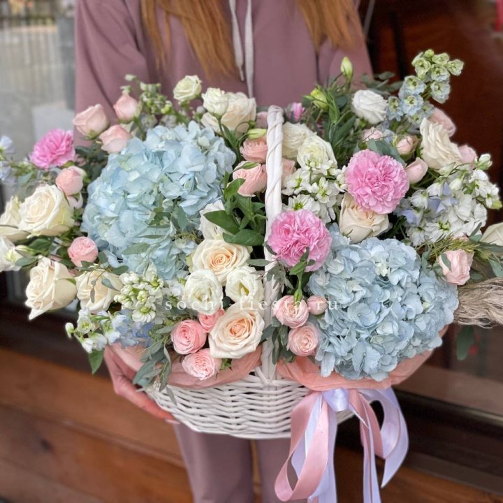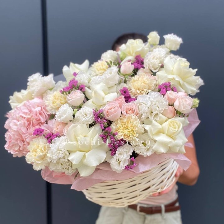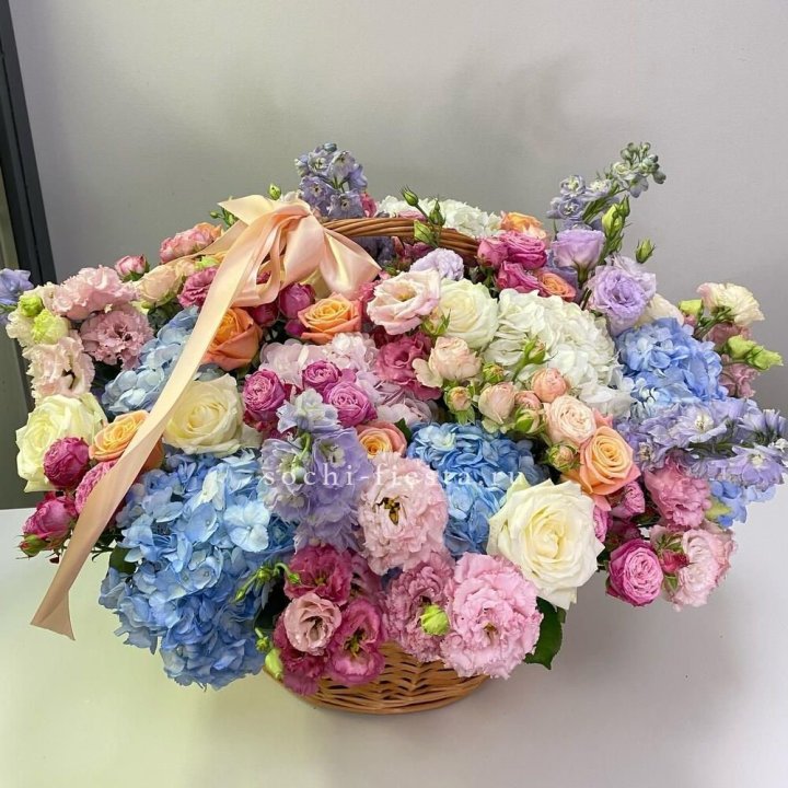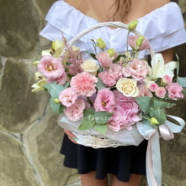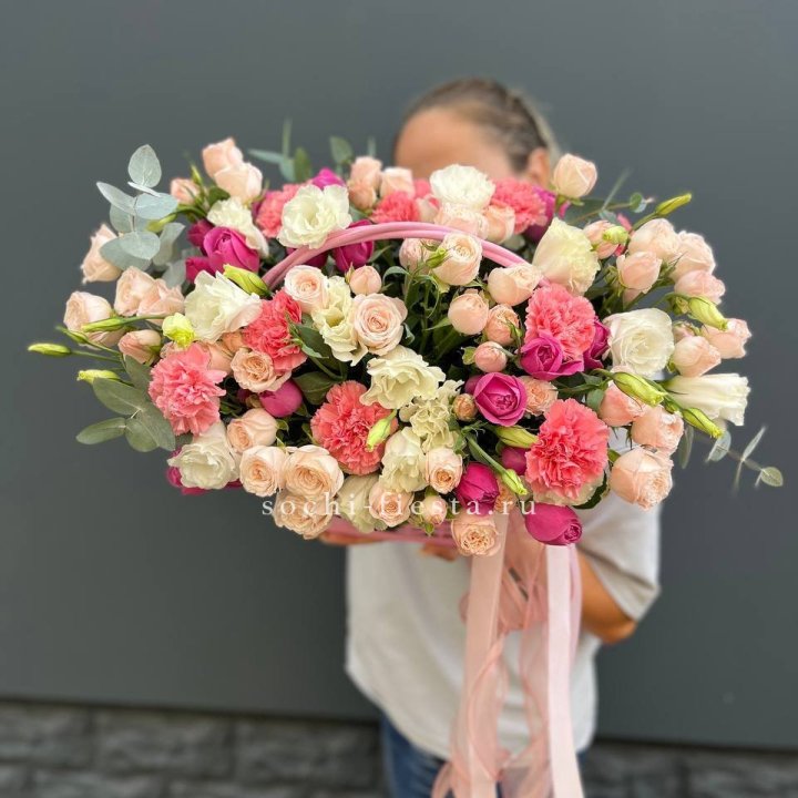 Ассортимент ростовских корзин формируется с учётом местной специфики. Кубанские розы — более доступные и свежие, чем голландские. Пионы в мае из кубанских хозяйств — в идеальном состоянии. Хризантема, альстромерия, лилия — для объёмных наполнений. Гербера и эустома — для ярких садовых миксов. Зелень: аспарагус, эвкалипт, лиственница. Флорист создаёт корзину из лучшего, что есть в поставке.