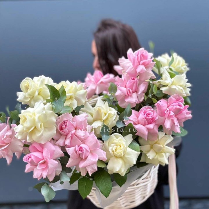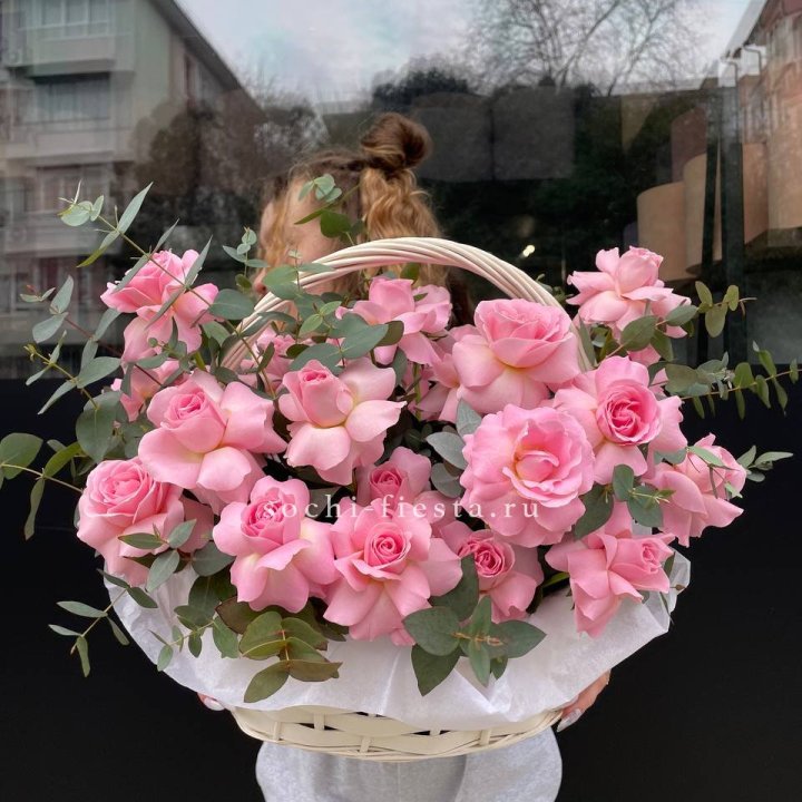 - Большая именинная корзина — розы или пионы куполом, объёмная, торжественная.