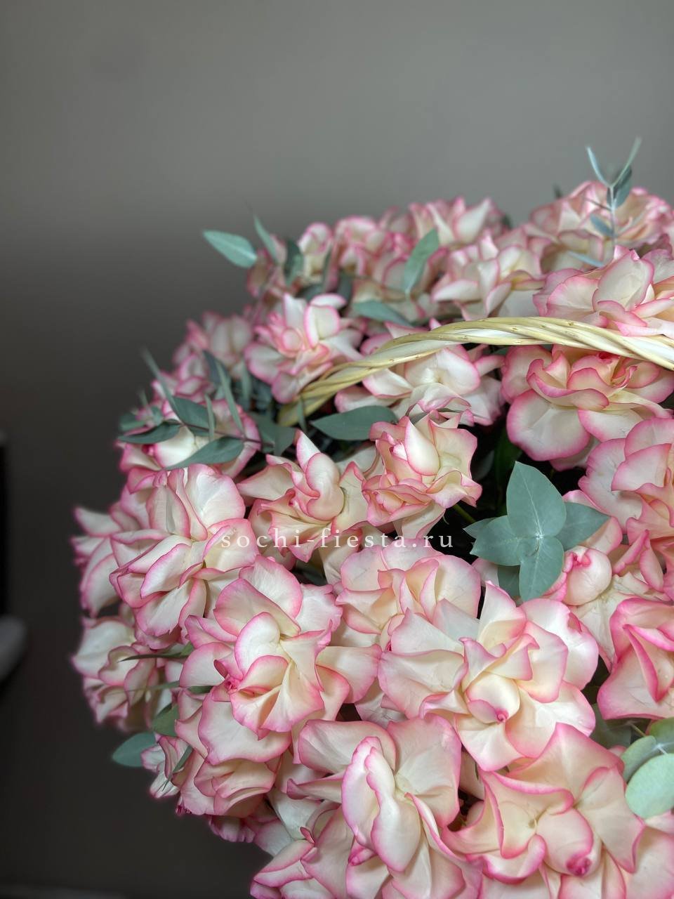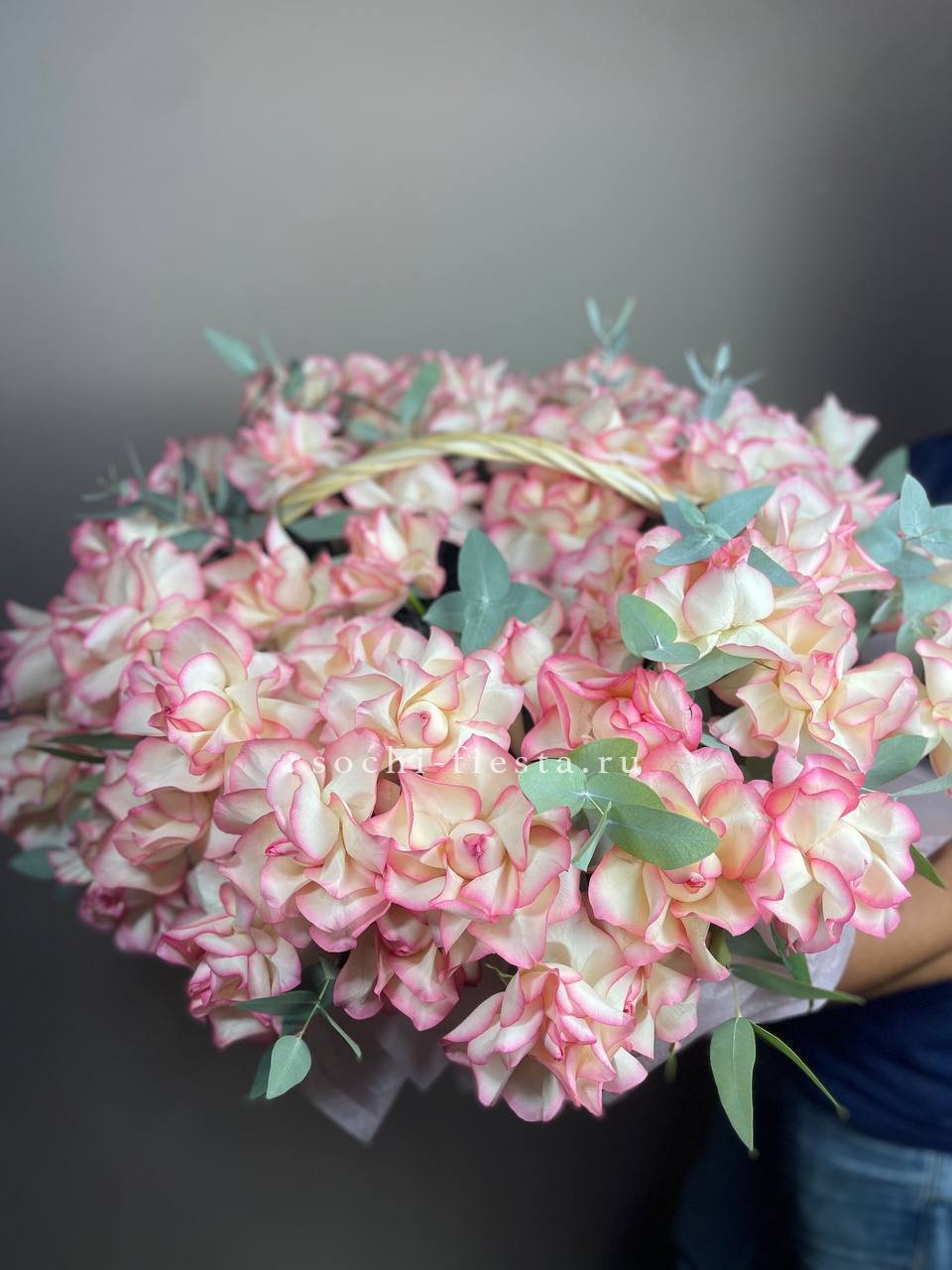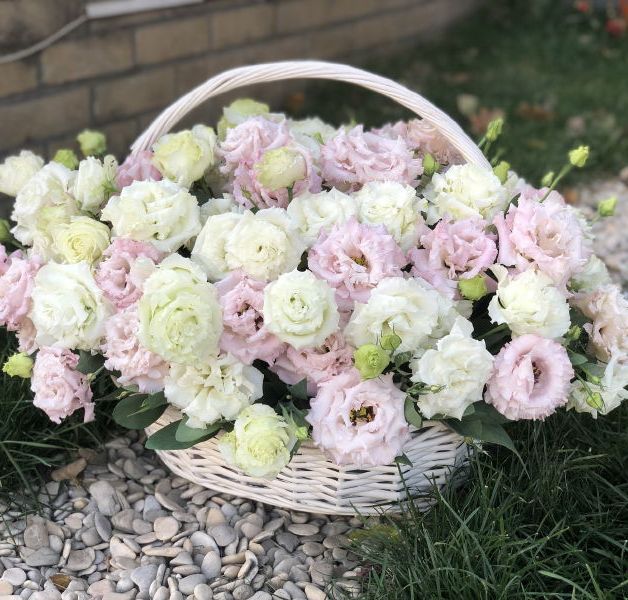 корзина из нежных цветов диантусов, роз, эустомы.