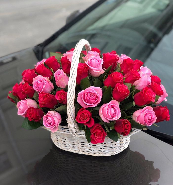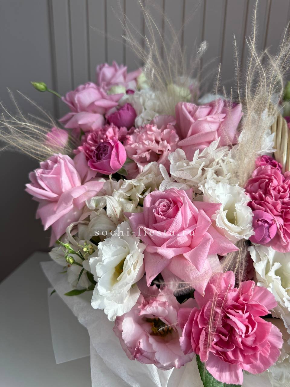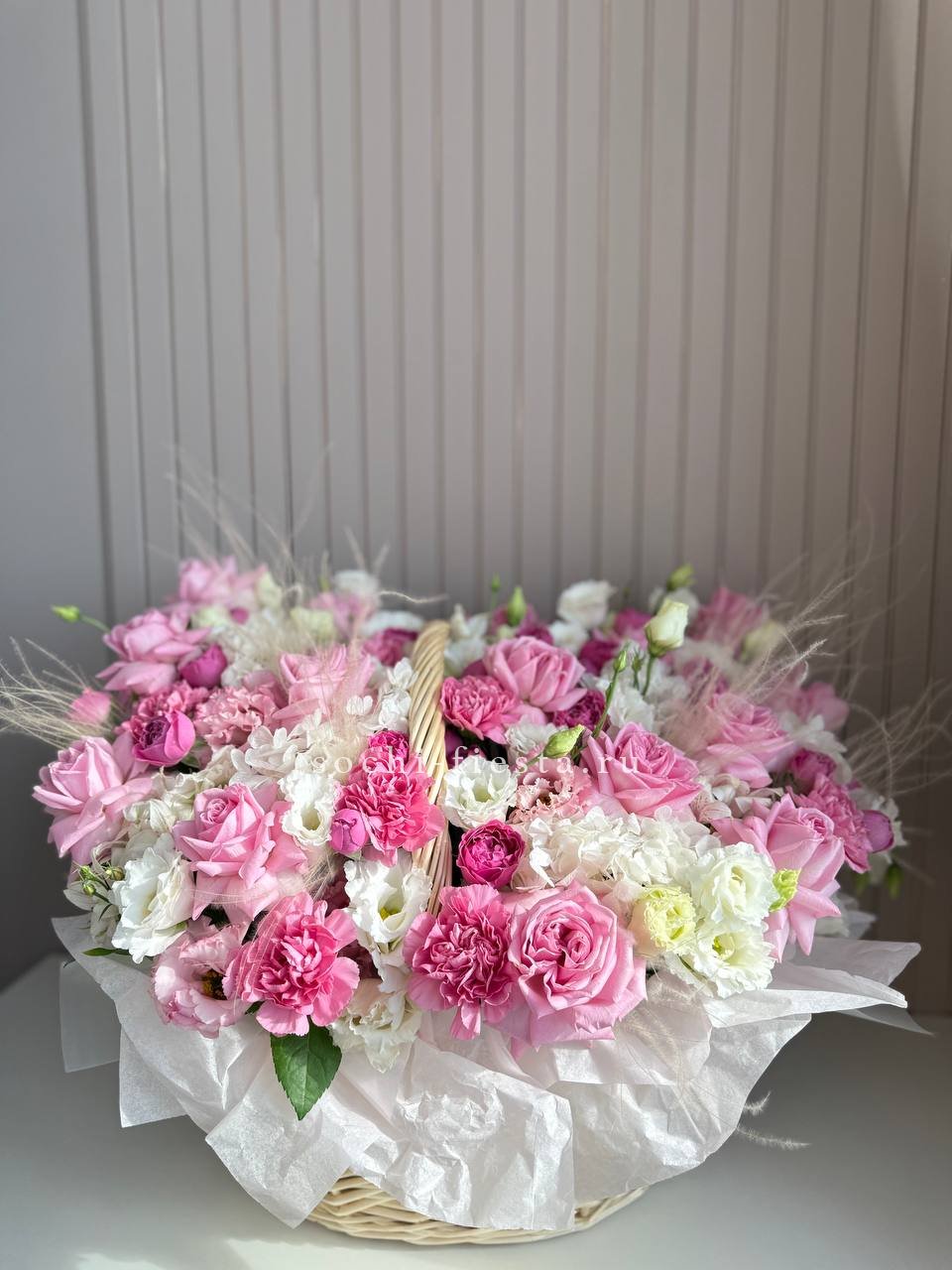 Диантусы создают воздушную текстуру, розы добавляют объем, а эустома раскрывается мягкими волнами. Композиция собрана в корзине и держит форму без лишних деталей.