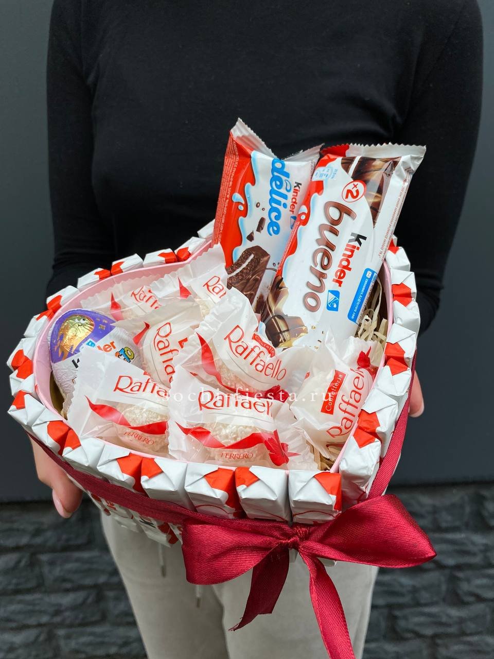 Коробка в форме сердца собрала внутри Рафаэлло, шоколадные батончики Bueno, хрустящий Delice и классический Киндер. Всё уложено так, чтобы сразу захотелось открыть и попробовать. Готовое решение для сладкого сюрприза.