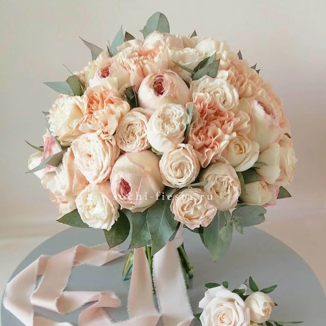 Девятнадцать бутонов эустомы раскрываются слоями воздушных лепестков создавая мягкую текстурную глубину. Эвкалипт добавляет свежести этому монохромному свадебному решению.