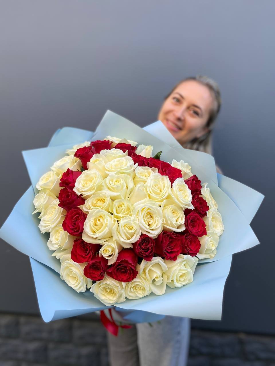 Белые и красные розы переплетаются в динамичной игре света и тени. Двадцать семь бутонов создают живописный рисунок, где каждый цвет усиливает звучание другого без лишних слов.