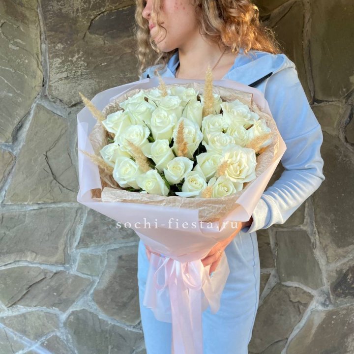 25 белых роз с сухоцветами