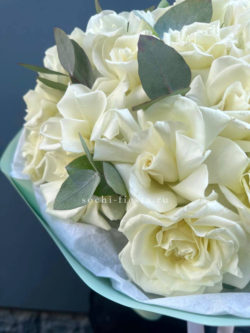 Вывернутые лепестки французских роз Notte Bianca раскрываются широко и создают объемную текстуру. Двадцать пять бутонов в окружении эвкалипта выглядят современно и графично.