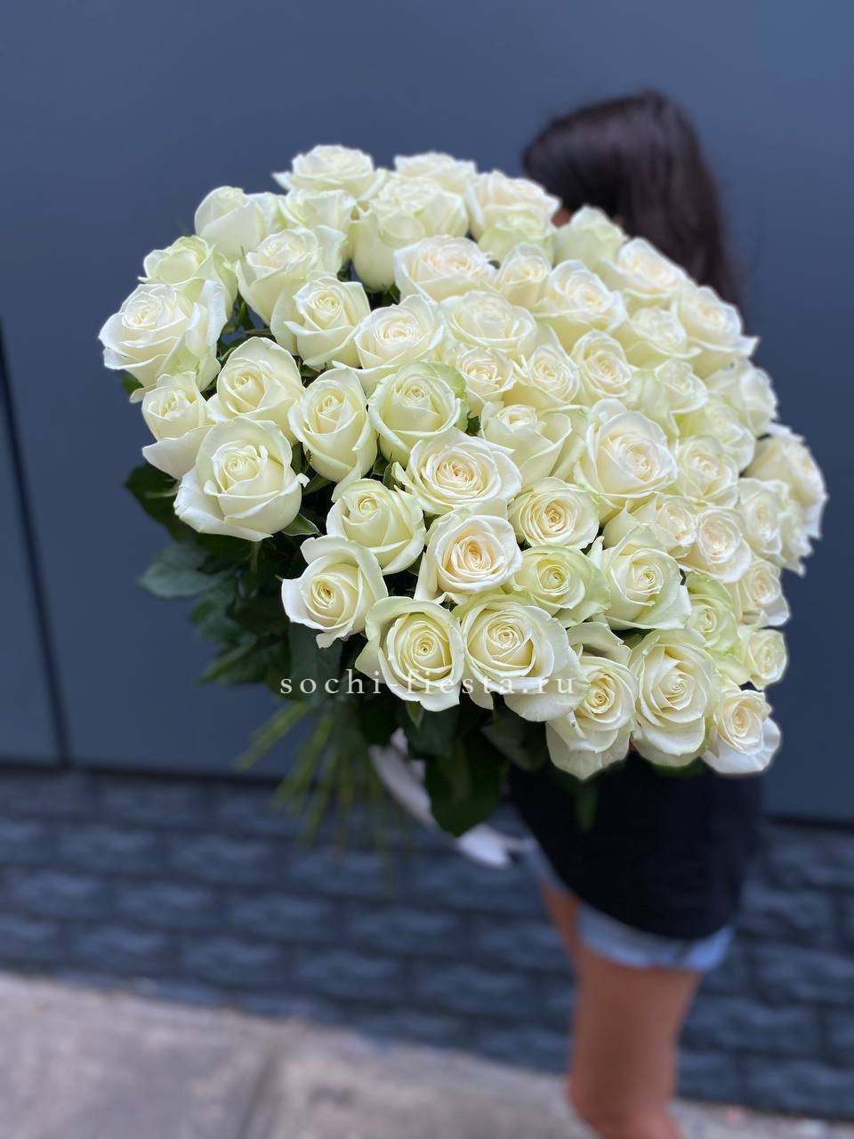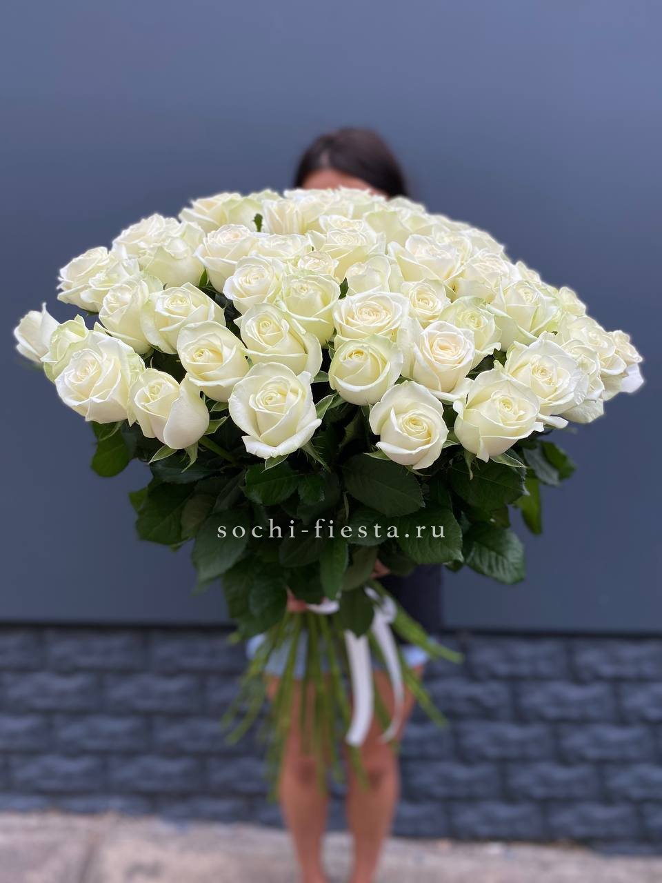 Пятьдесят один бутон выстраиваются в объёмную сферу с чёткой геометрией. Белые розы держат форму и создают ощутимое визуальное присутствие. Букет занимает пространство уверенно и спокойно.