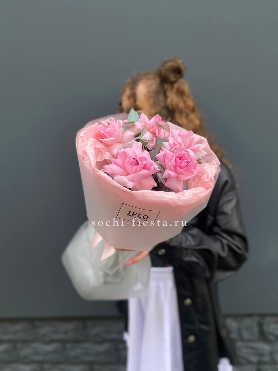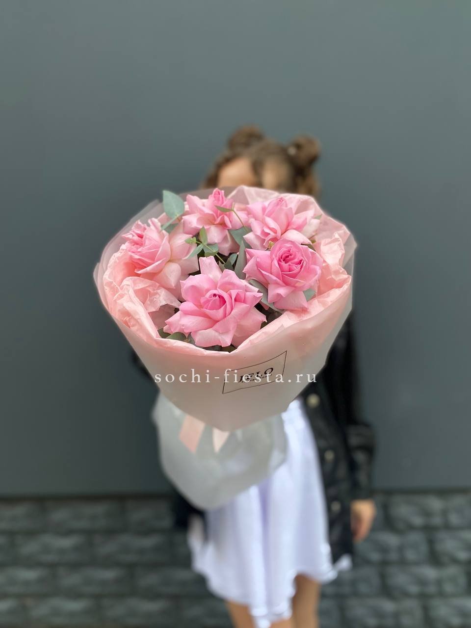 Пять вывернутых роз открывают всю внутреннюю структуру лепестков и демонстрируют розовый цвет во всей его глубине. Эвкалипт обрамляет бутоны и придает букету завершенность.