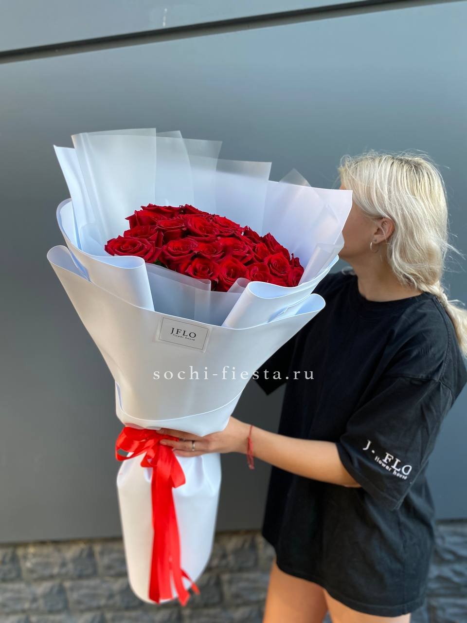Двадцать пять бутонов выстраиваются в пышную композицию с чётким ритмом и объёмным силуэтом. Голландские розы создают впечатление монументальности и уверенной подачи.