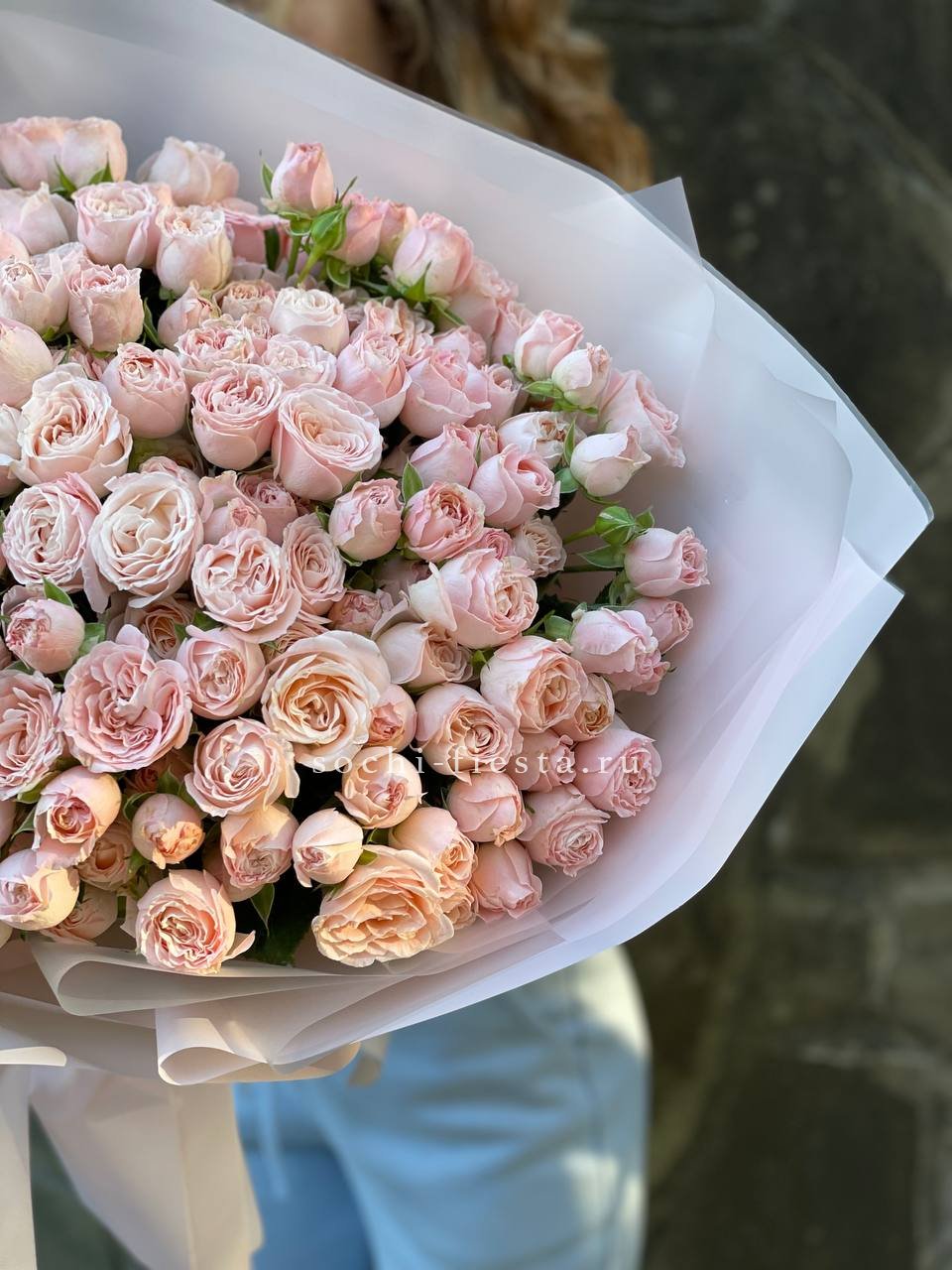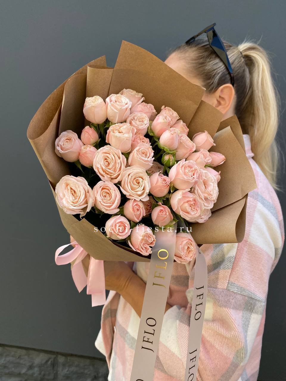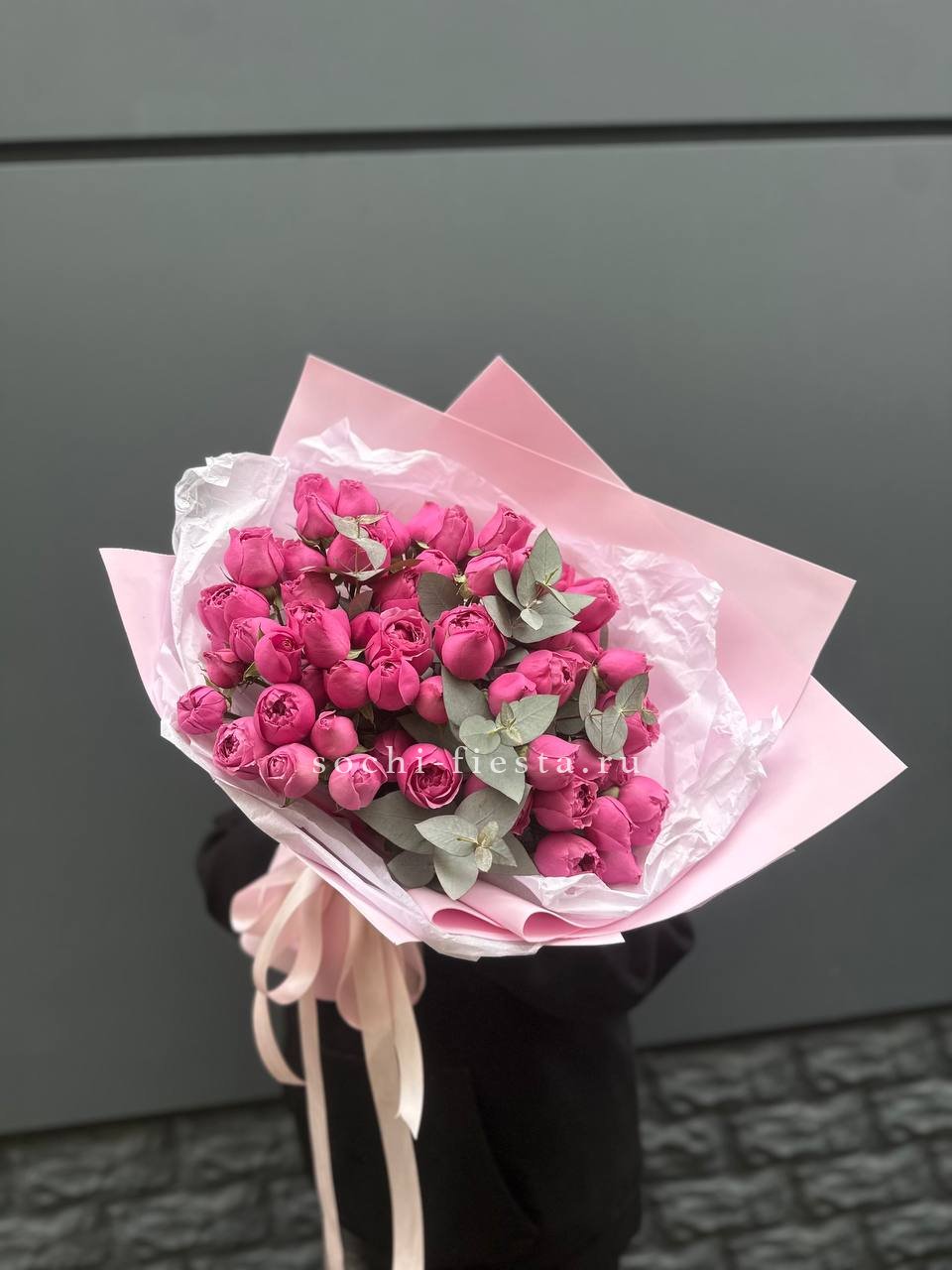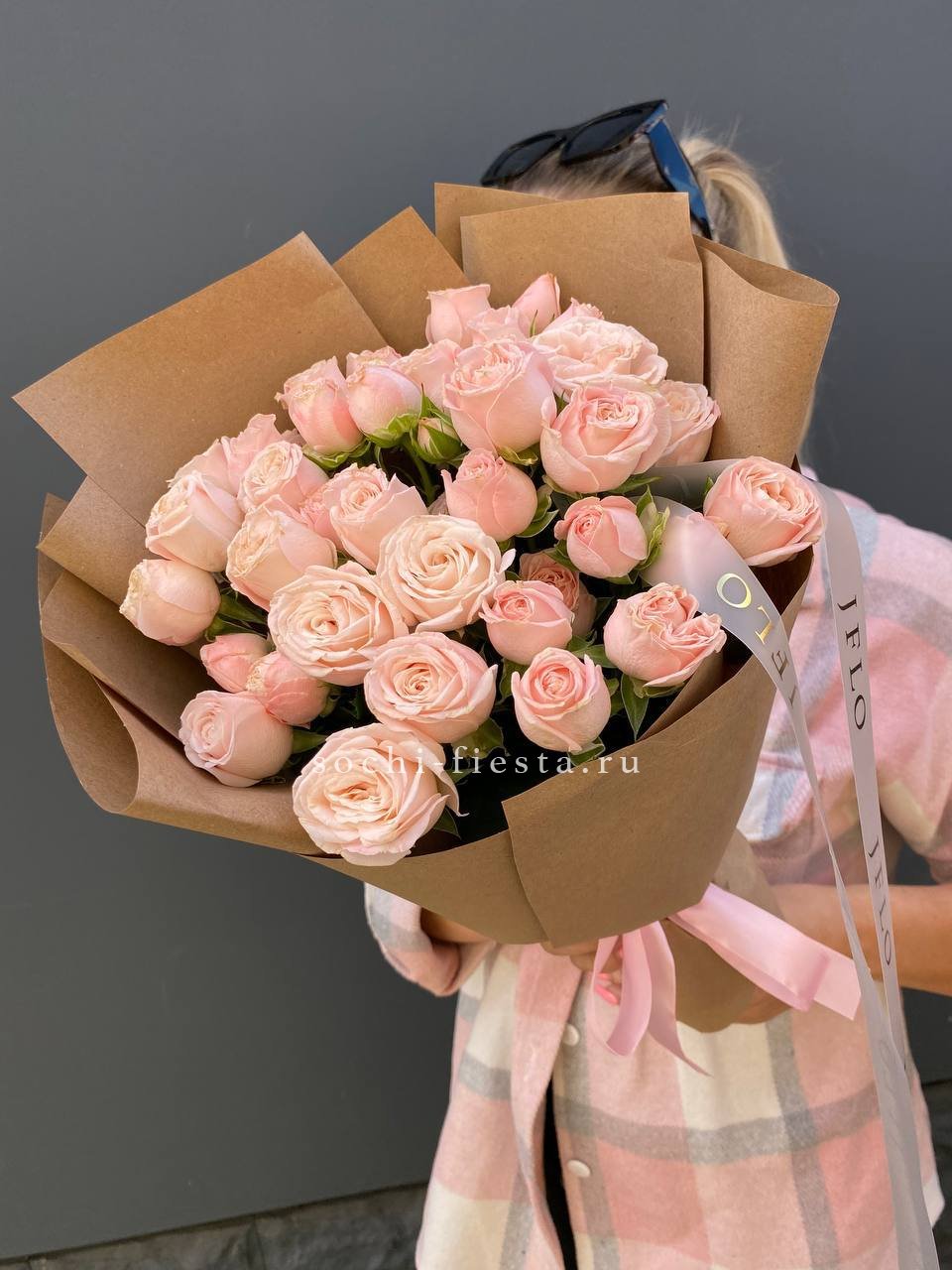 25 пионовидные кустовые розы,  хлопок, лента, дизайнерская упаковка.
