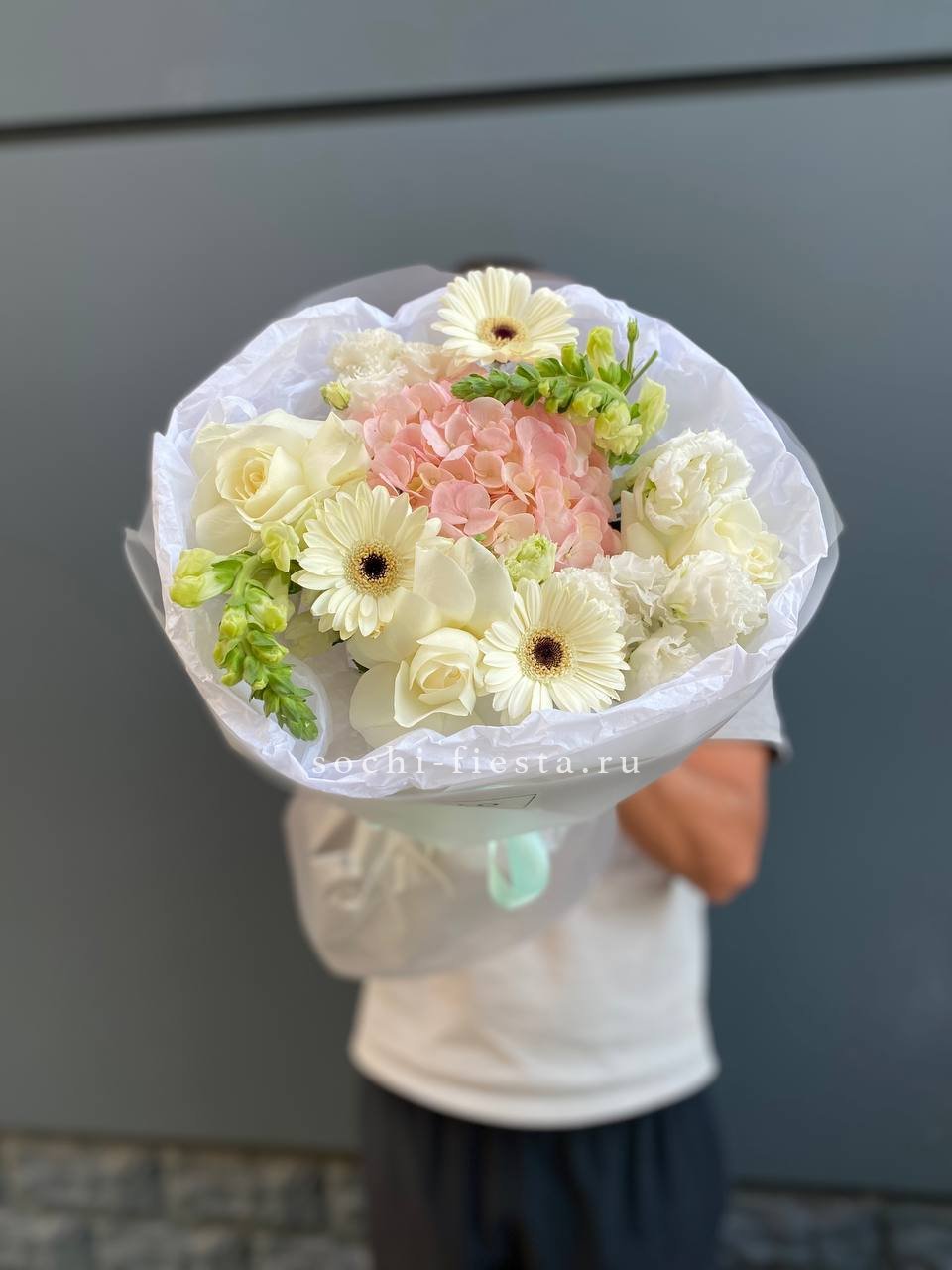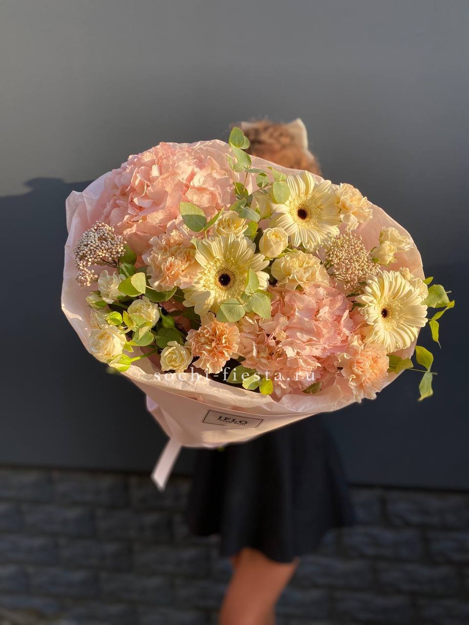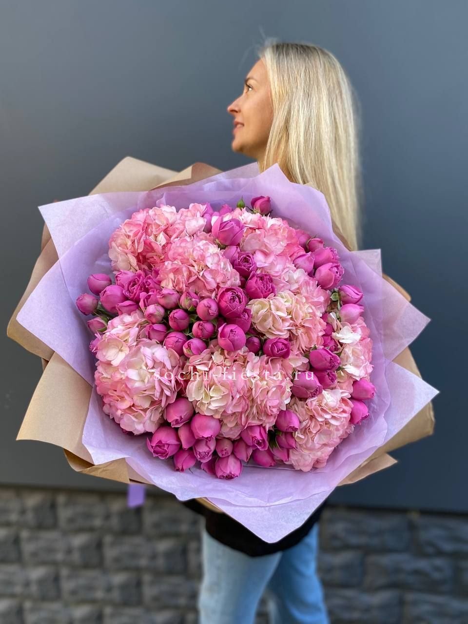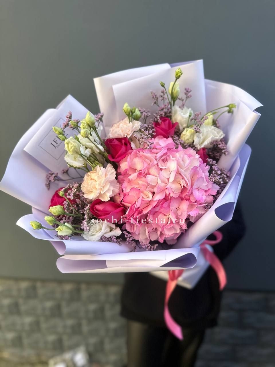 гортензия, розы джумилия, бомбастик, альстромерия, маттиола, чико, авторское оформление.