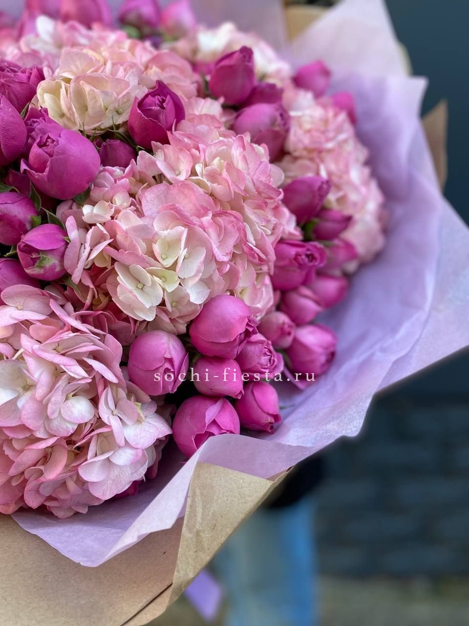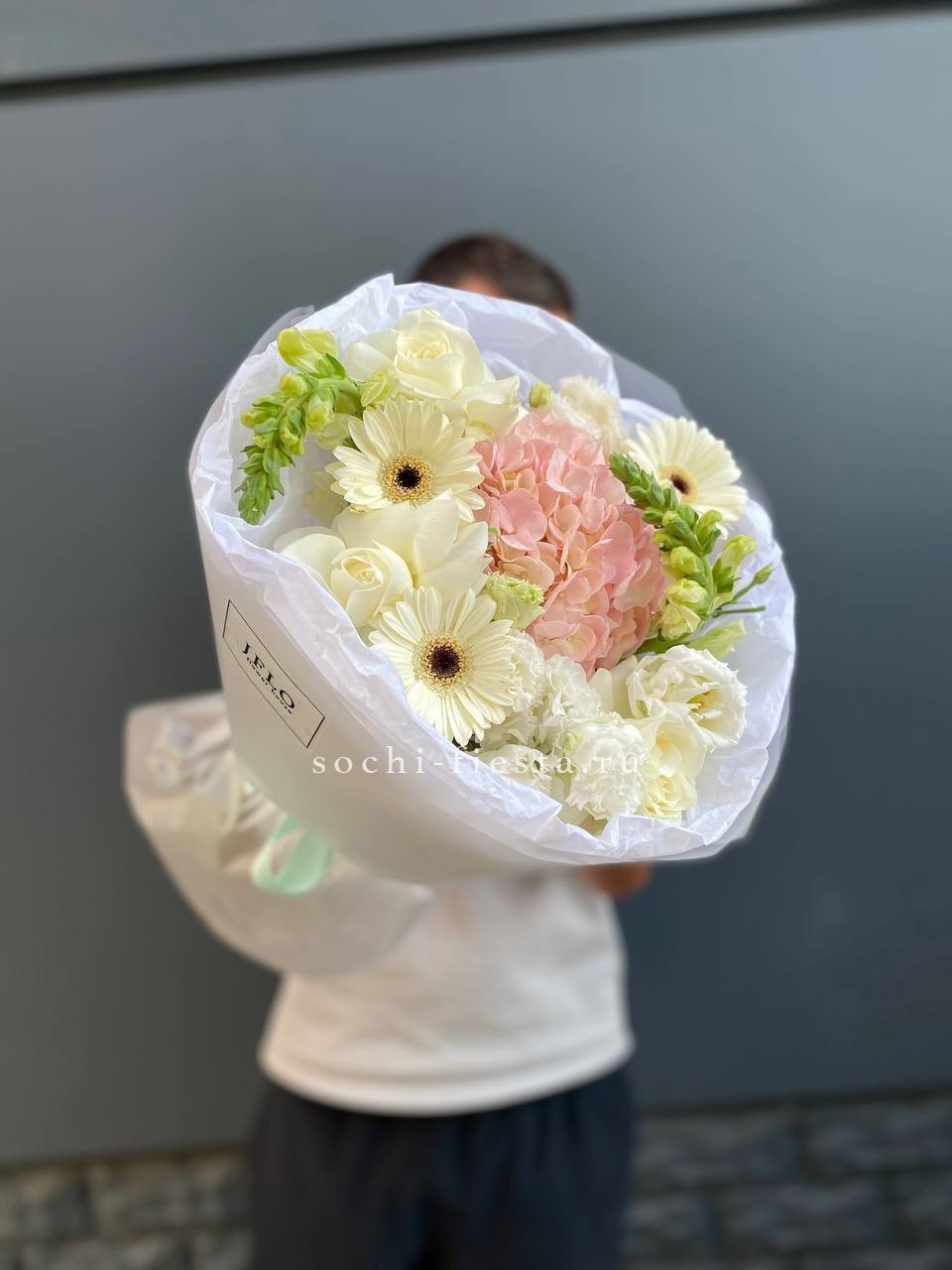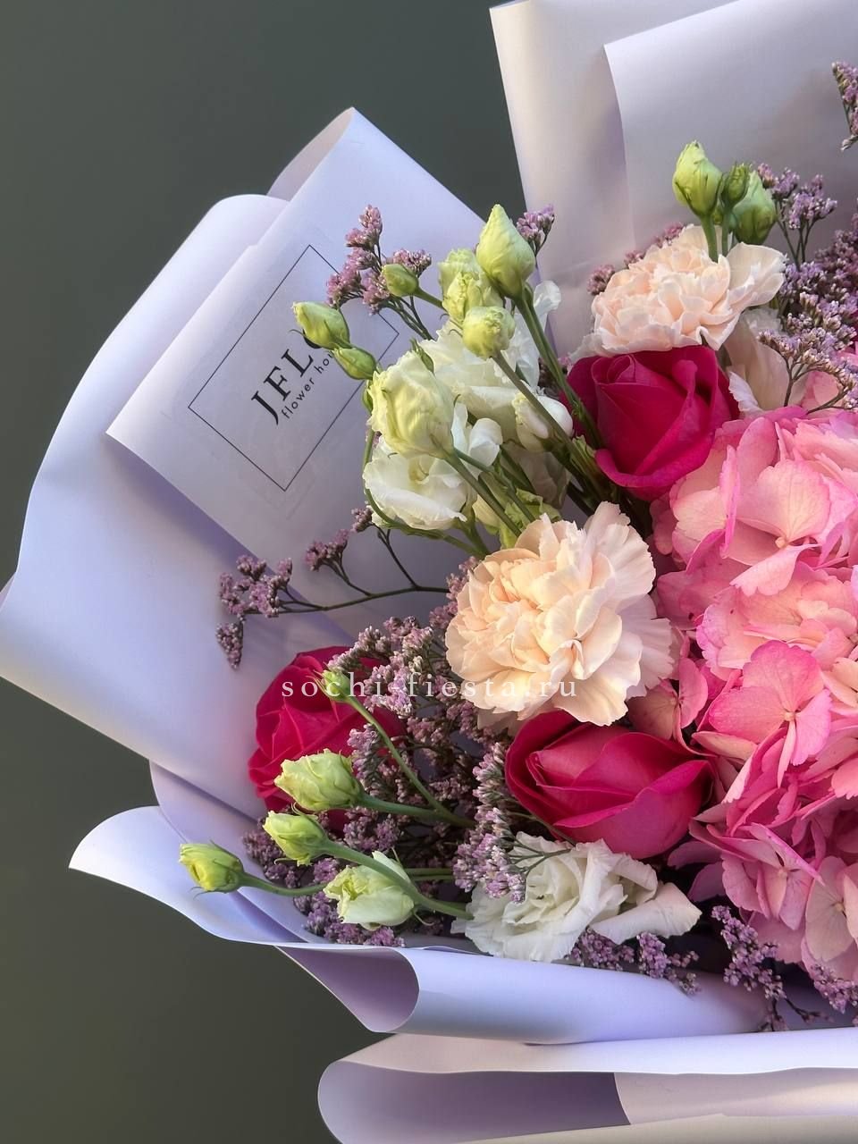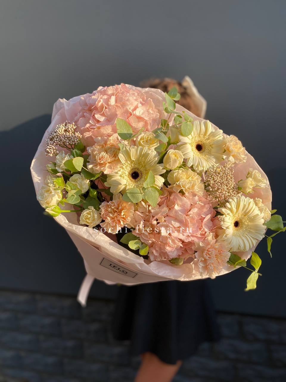 гортензия, розы джумилия, бомбастик, альстромерия, маттиола, чико, авторское оформление.