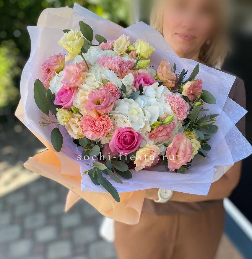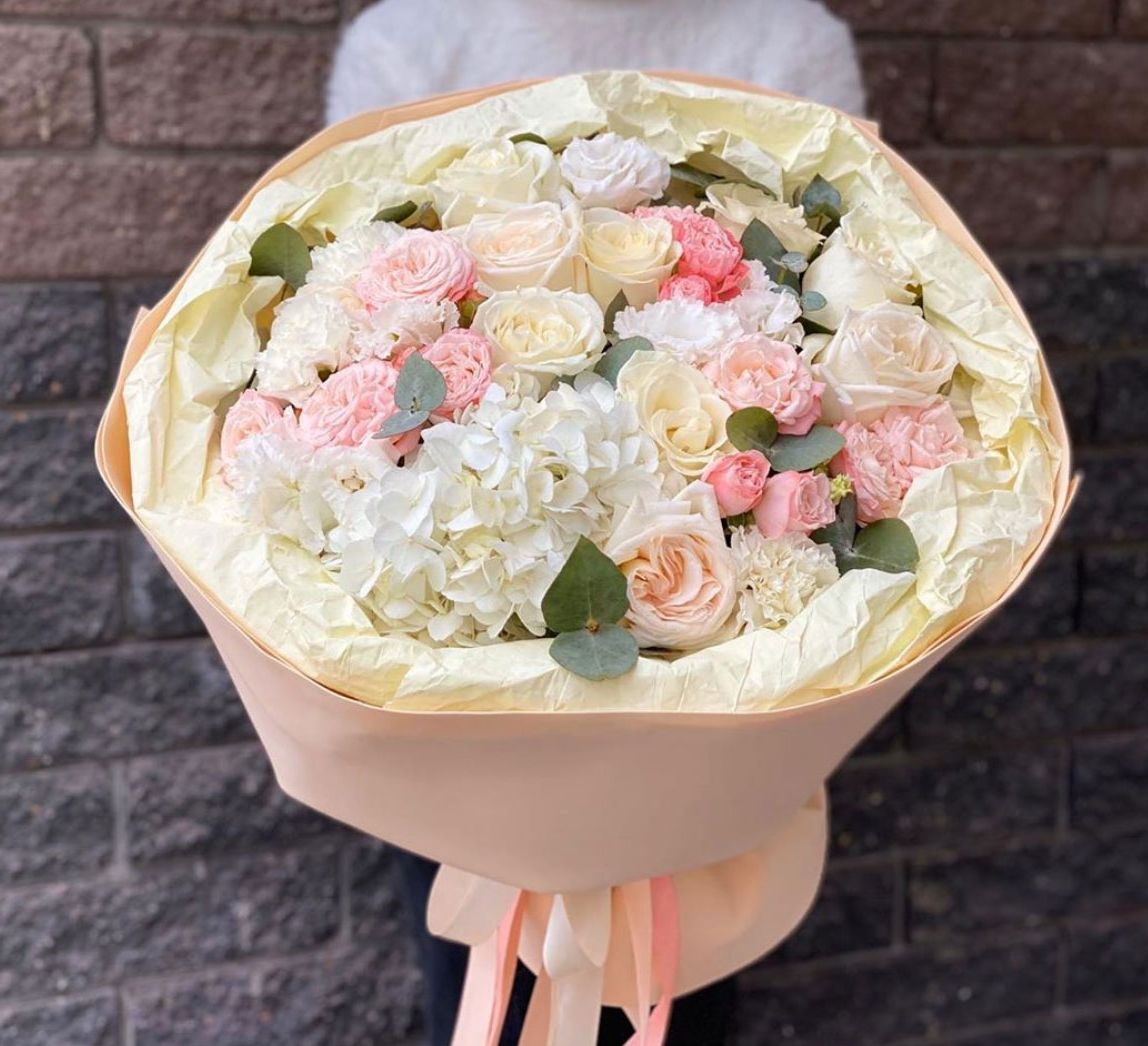 Воздушная композиция с пышной гортензией и розами Джумилия создает объемный силуэт. Маттиола и альстромерия добавляют легкости, а бомбастик вносит яркие акценты в общую структуру букета.