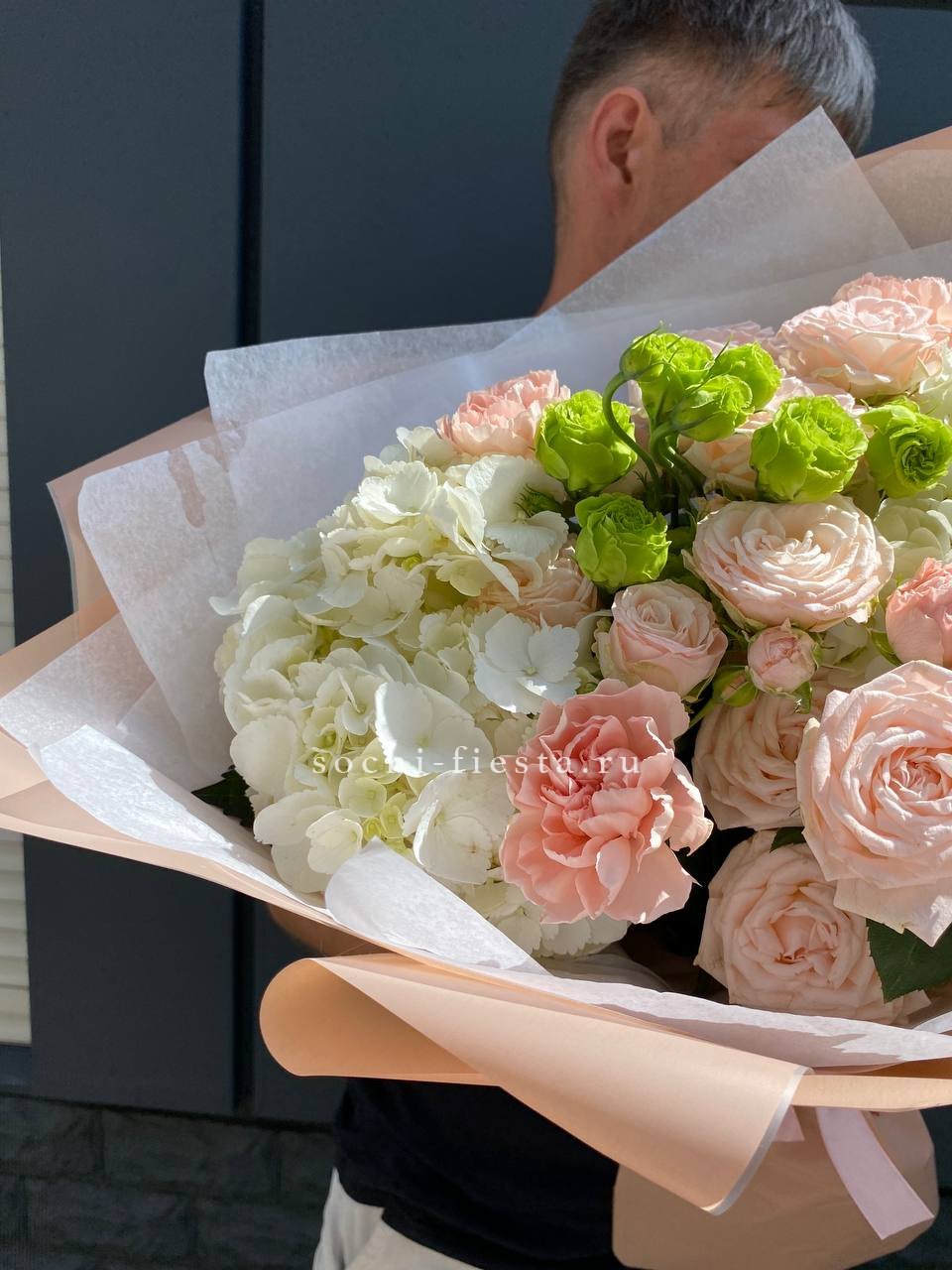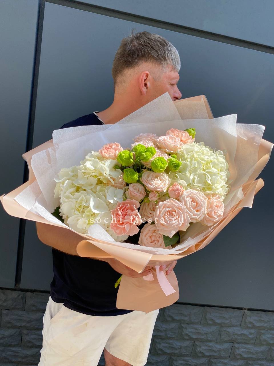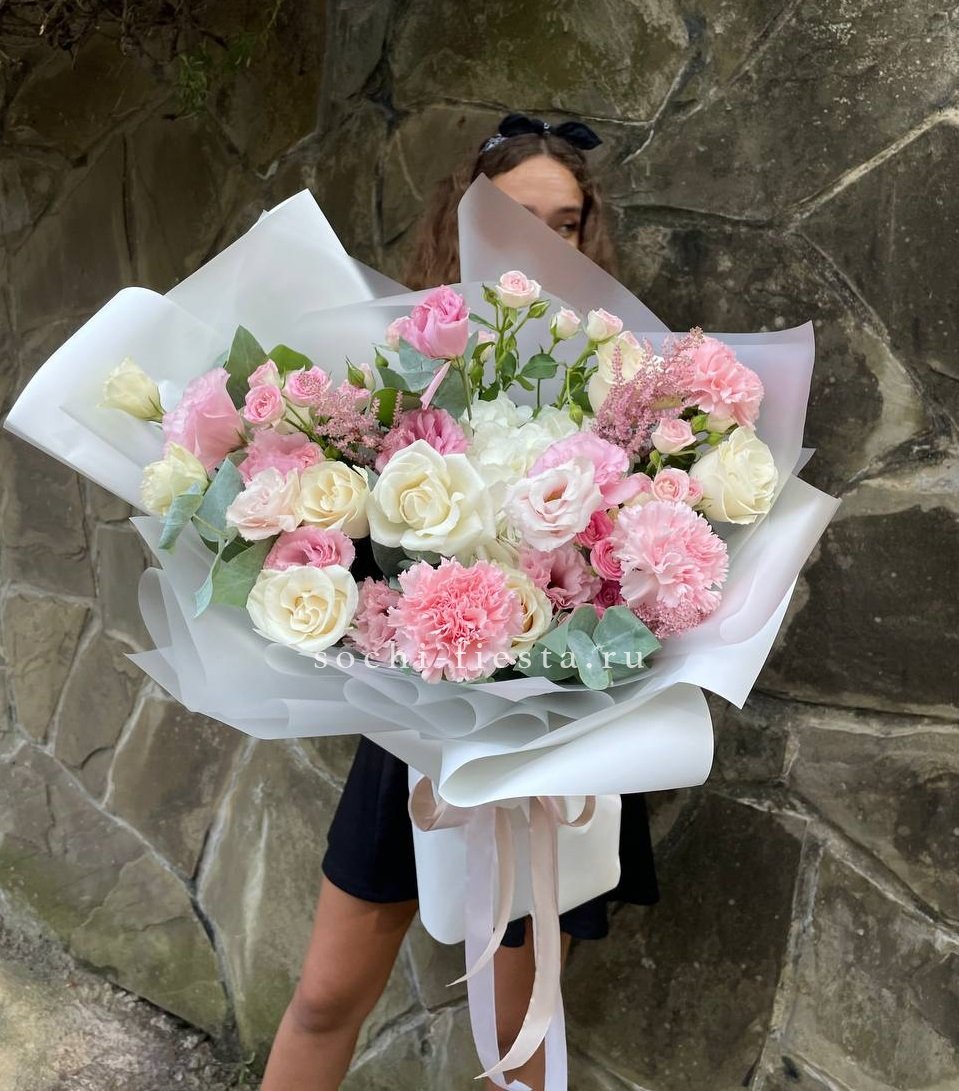 маттиола, розы, гортензия, диантусы, хризантемы , лента и дизайнерская пленка.