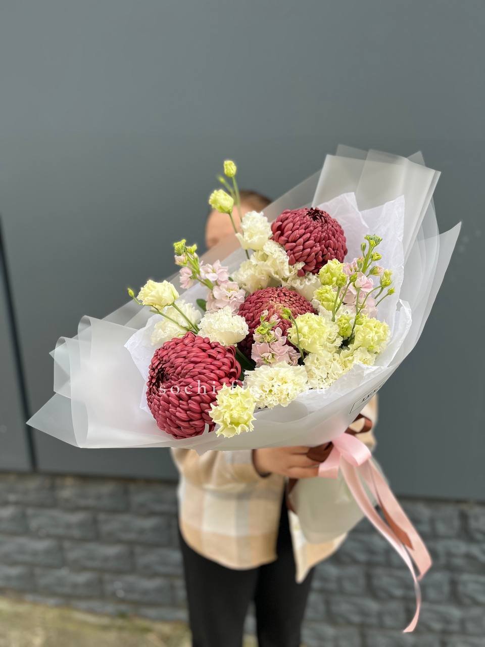 Маттиола наполняет букет весенним ароматом и текстурой вытянутых соцветий. Кудрявая хризантемия Бигуди и многослойная эустома создают объём и лёгкость, которая освежает пространство.