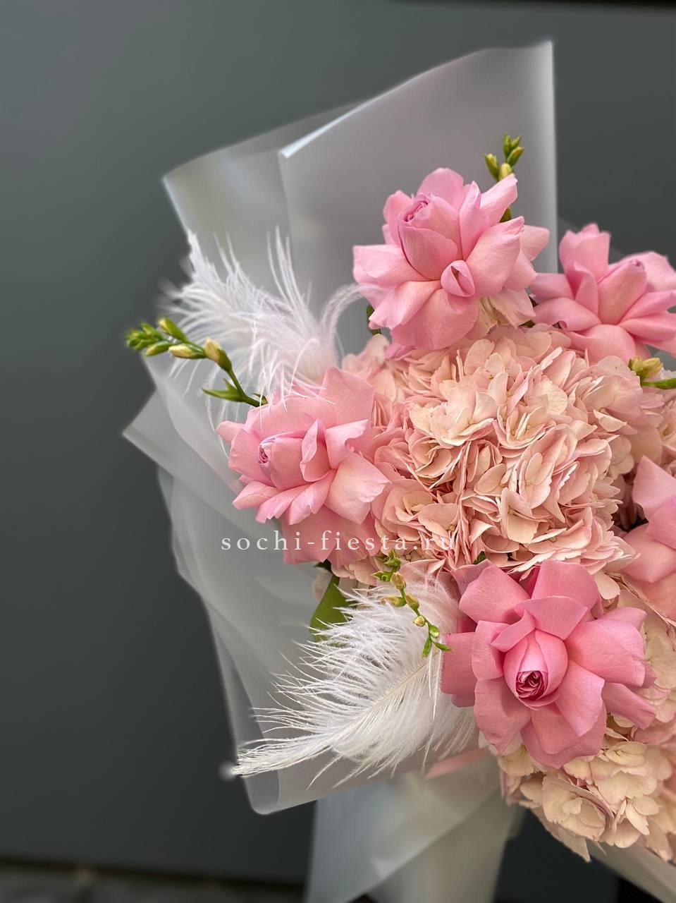гортензии, розовая роза, перья, упаковка.