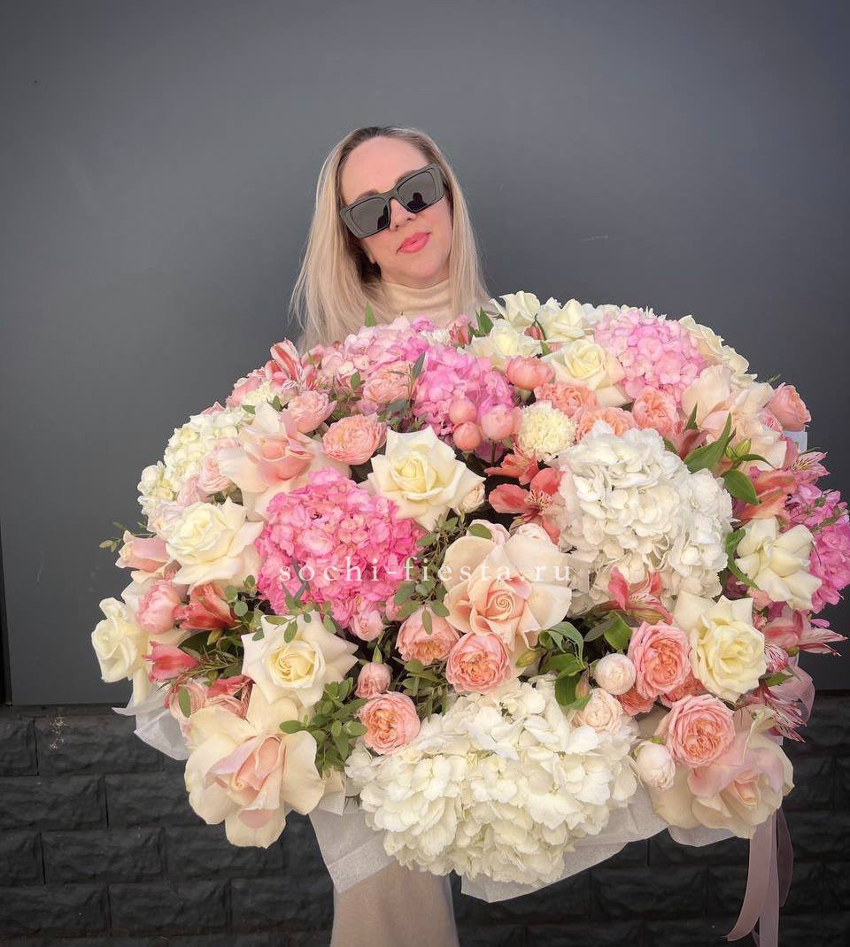 Пышные шапки гортензии задают объём, а россыпь кустовых роз создаёт живую текстуру по всей форме. Композиция наполнена воздухом и естественной лёгкостью.