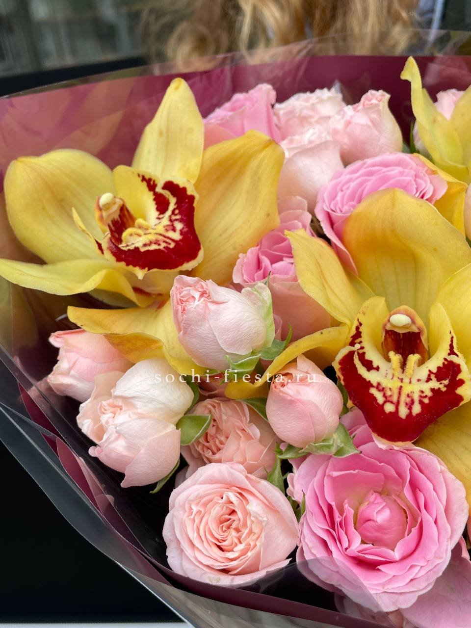 орхидея, роза, пионовидная роза бомбастик,  лента, дизайнерская пленка.