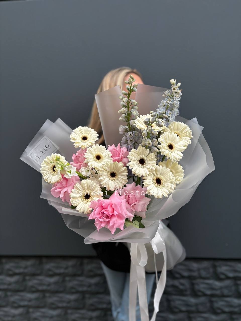 Розы и герберы соединяются с вертикальными свечами дельфиниума в динамичной композиции. Разные формы бутонов создают живой ритм и притягивают взгляд.