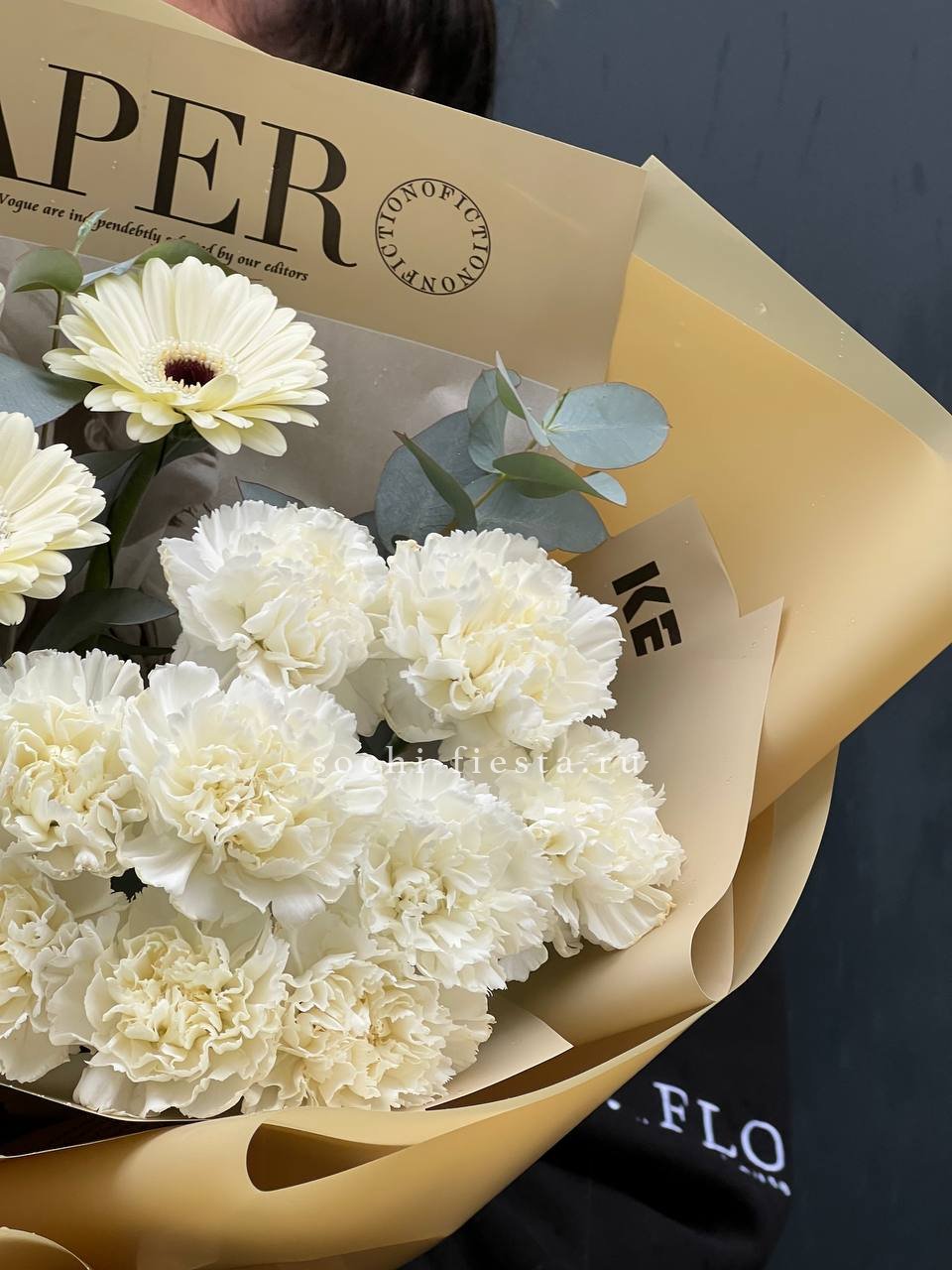 Яркие герберы и пышные диантусы создают лёгкую композицию с открытым силуэтом. Цветы словно парят в воздухе, а воздушная упаковка завершает образ без лишних деталей.